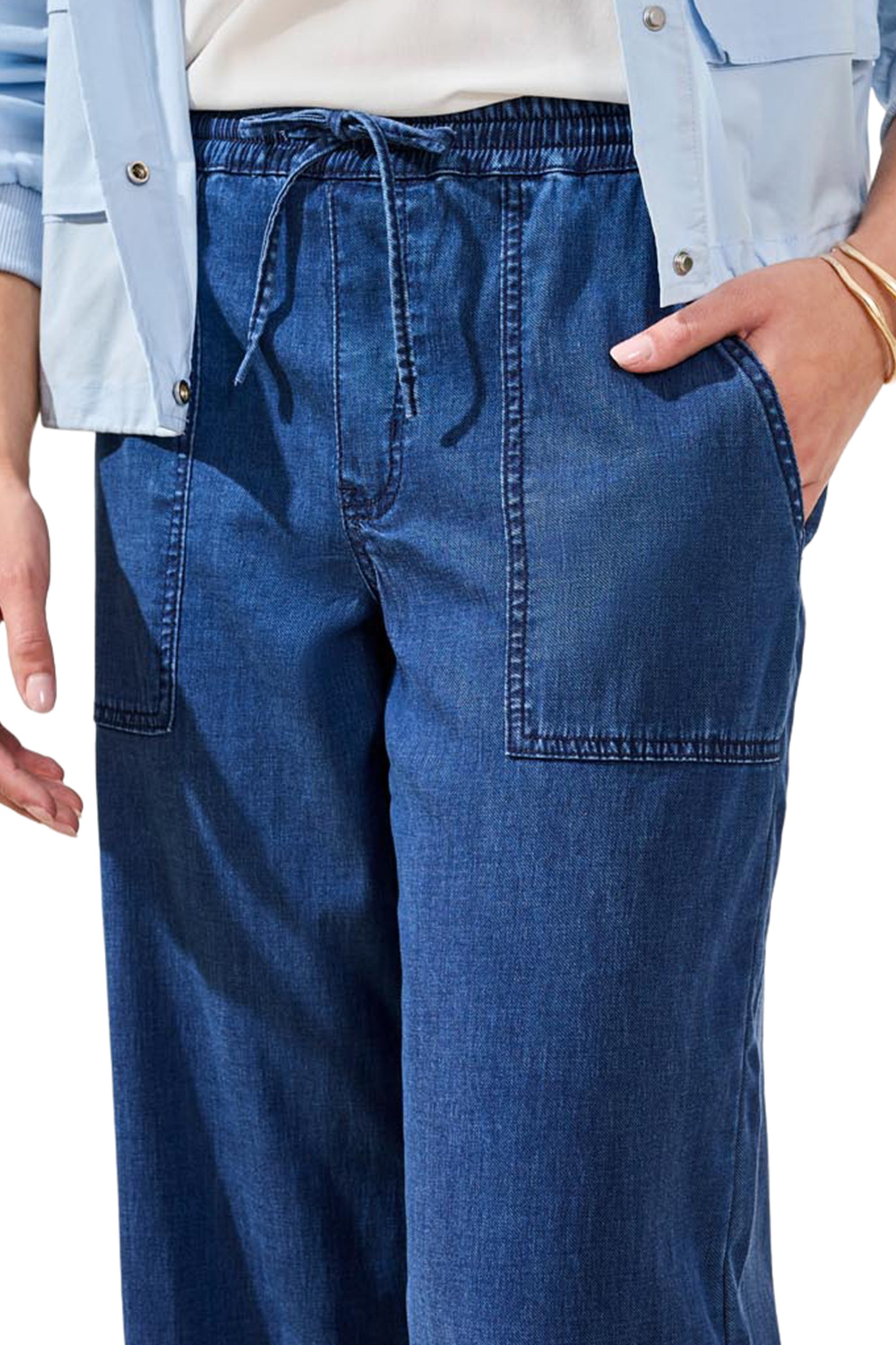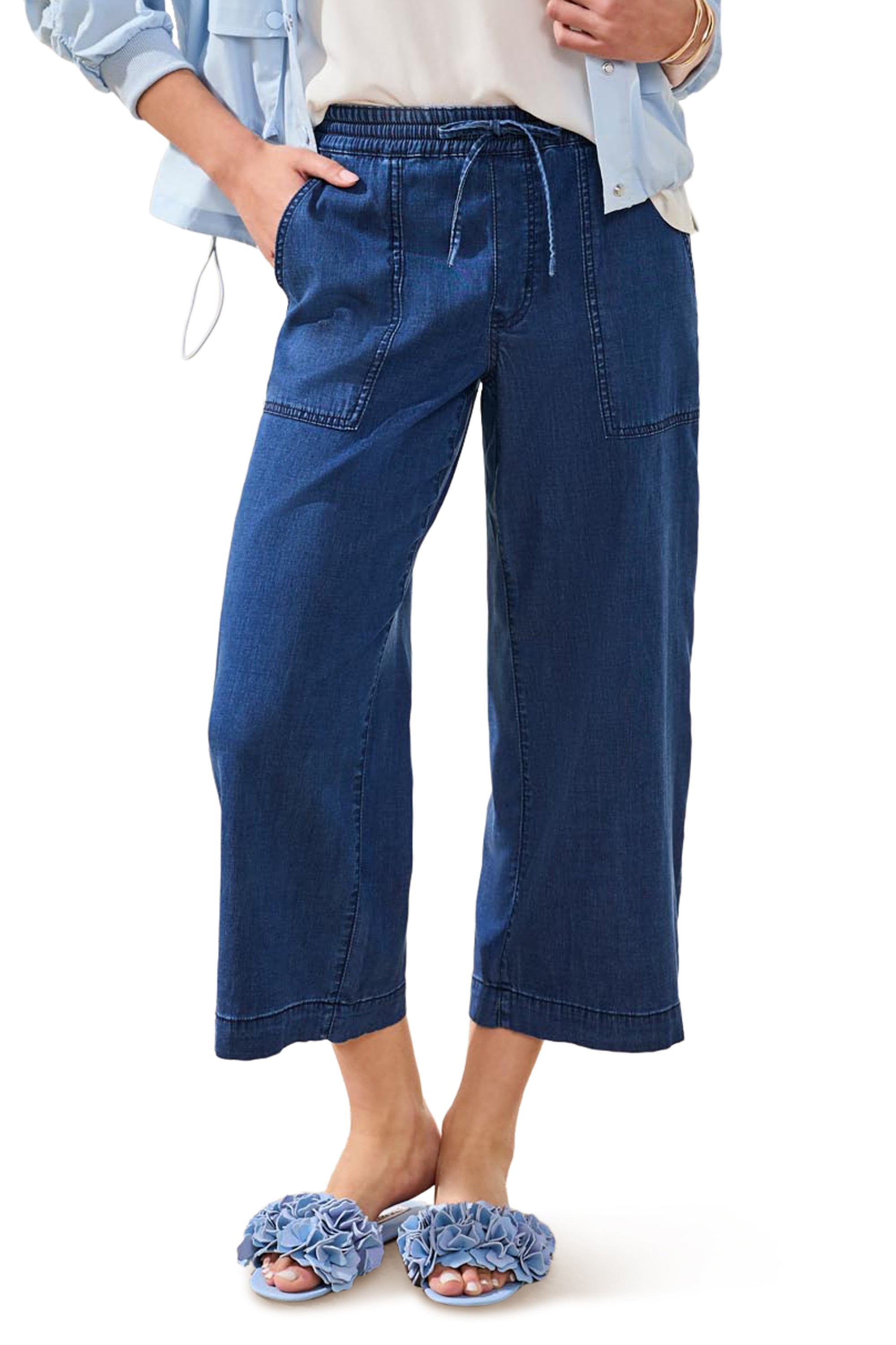 Don’t resort to sweatpants—these offer unmatched comfort with a polished look. Made from soft, stretch summer-weight denim twill, they feature a pull-on elastic waist with drawstring, oversized patch pockets front and back, and an easy-wearing wide-leg silhouette.