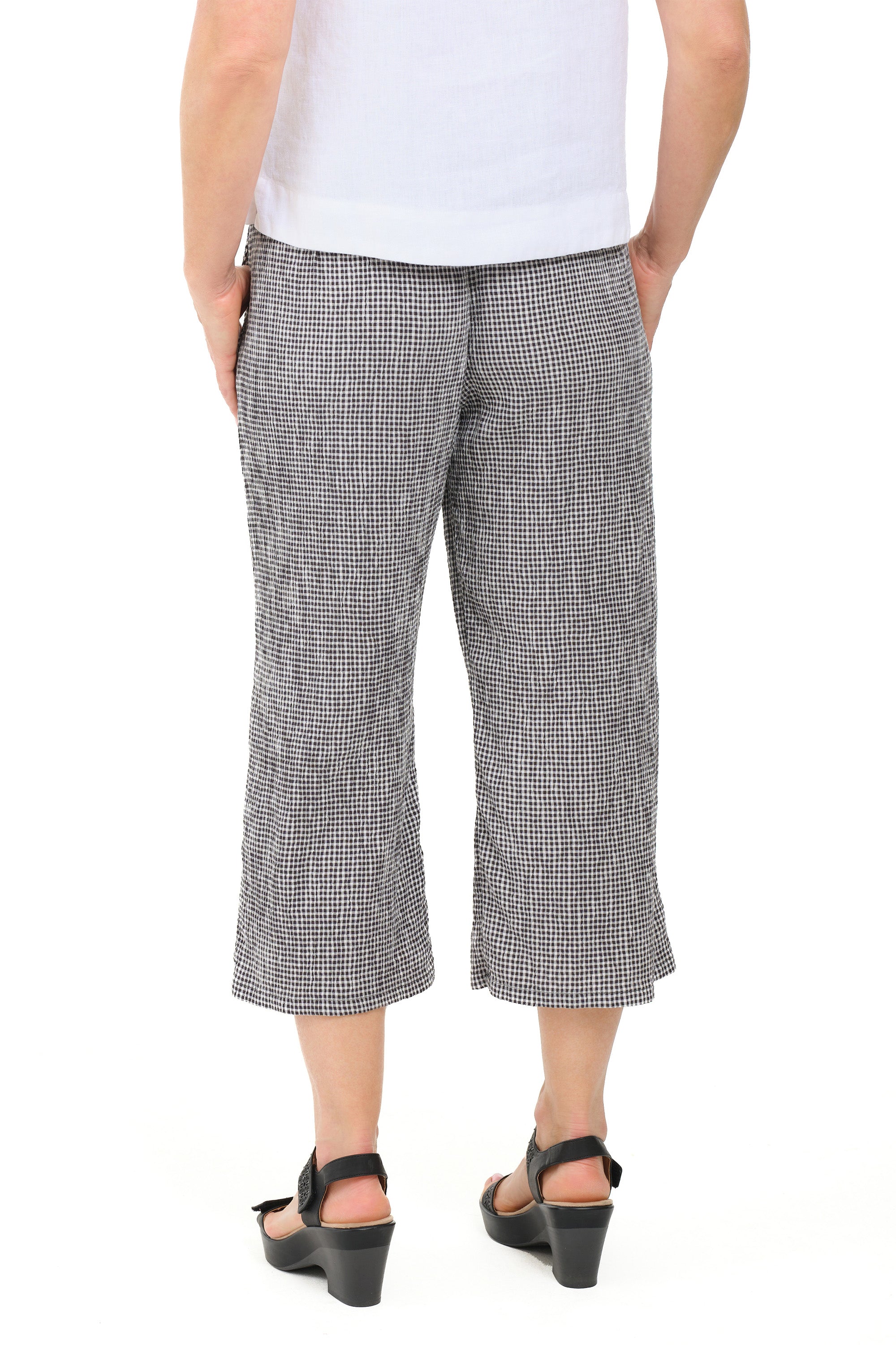 These pull-on crop pants in a black-and-white crinkle check pattern add texture and visual interest to any outfit. With a straight-leg, relaxed fit, and two slash pockets, they’re a versatile choice for both casual and polished looks.