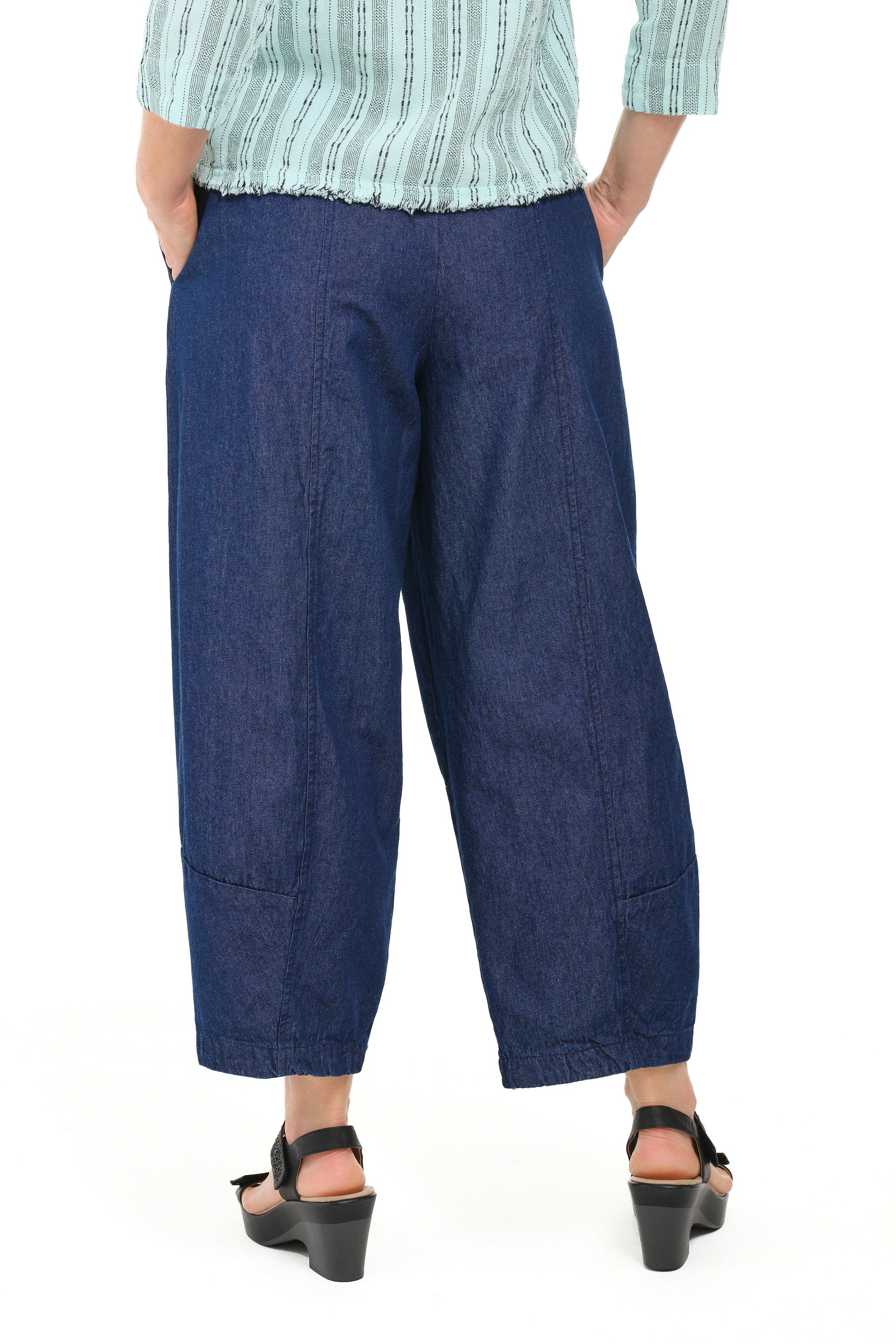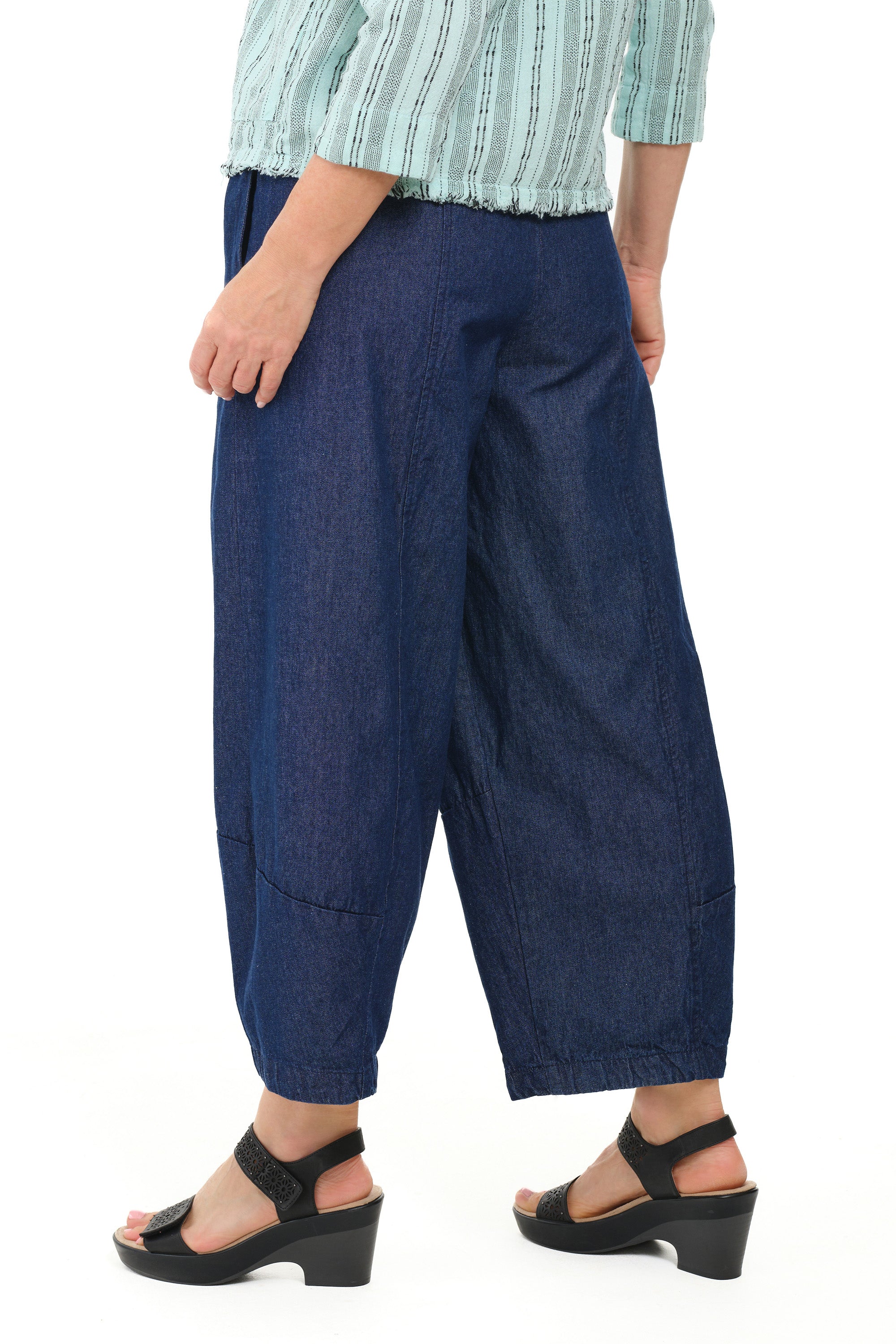 Lightweight cotton denim lantern pants feature a wide-leg silhouette that tapers gently toward the ankle, creating a modern shape that moves easily from day to night. A comfortable pull-on design with a stretch waistband and two on-seam pockets completes the look with relaxed sophistication.