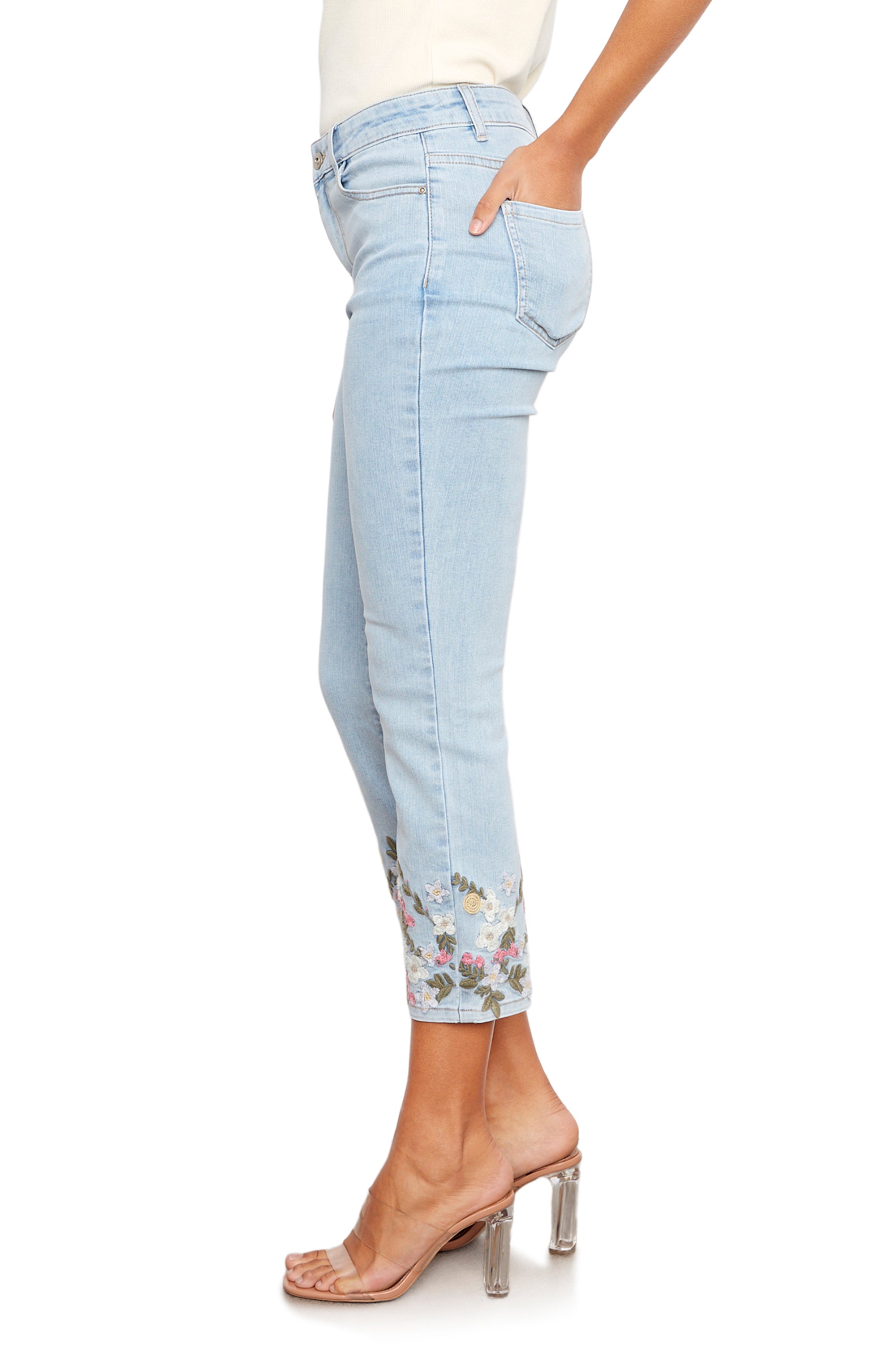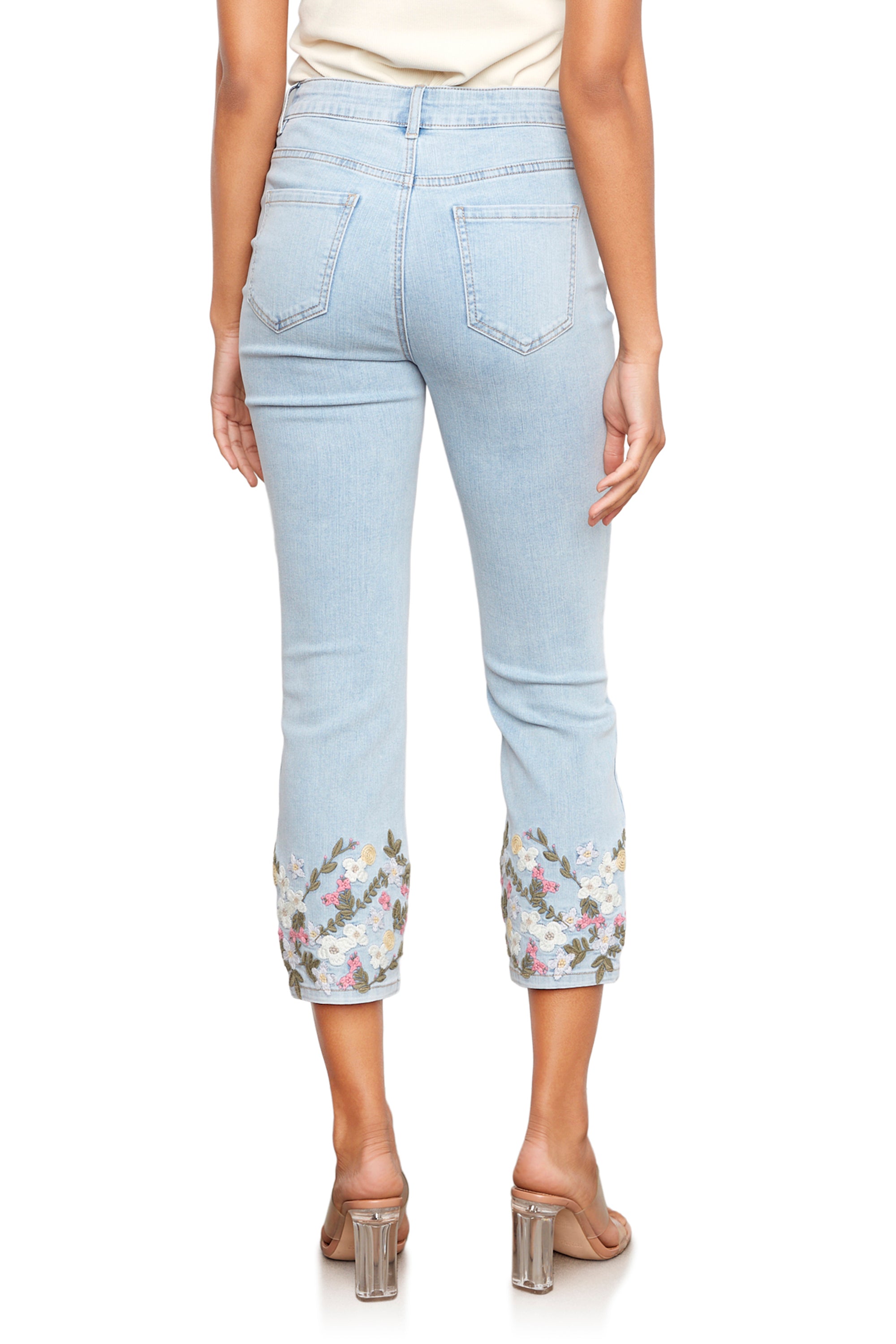 Playful flower and vine embroidery at the hem adds a dash of attitude and a sprinkle of color—let your legs do the talking. Crafted from soft, stretch denim in a vintage wash, these tapered jeans feature classic five-pocket styling and a zip-front closure for a look that’s equal parts polished and fun.