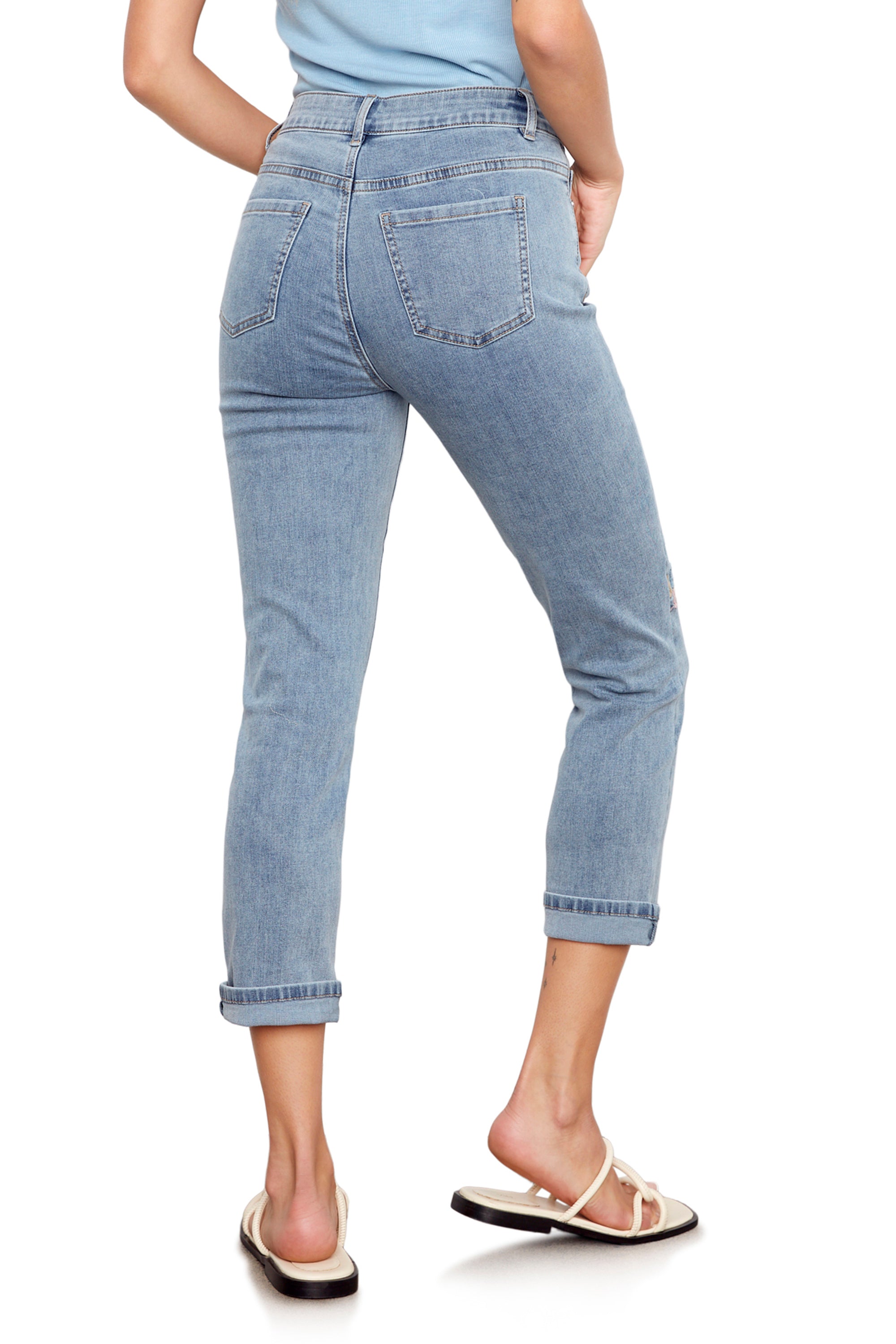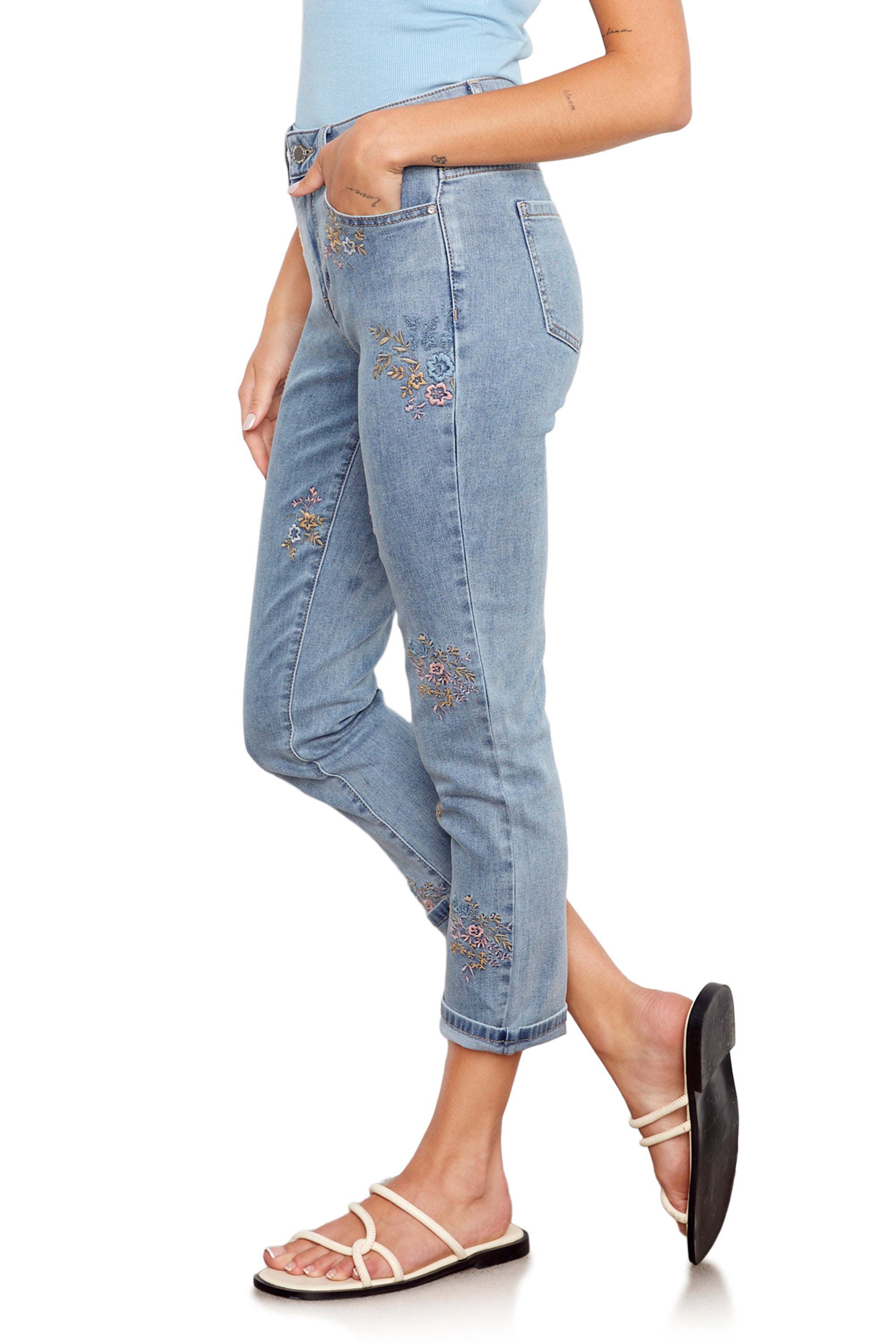 Meet your new denim darlings—soft stretch jeans in a vintage wash, adorned with delicate embroidered bouquets. Designed with classic five-pocket styling, a zip-front closure, a tapered leg, and a playful cuff, they blend timeless appeal with feminine flair.