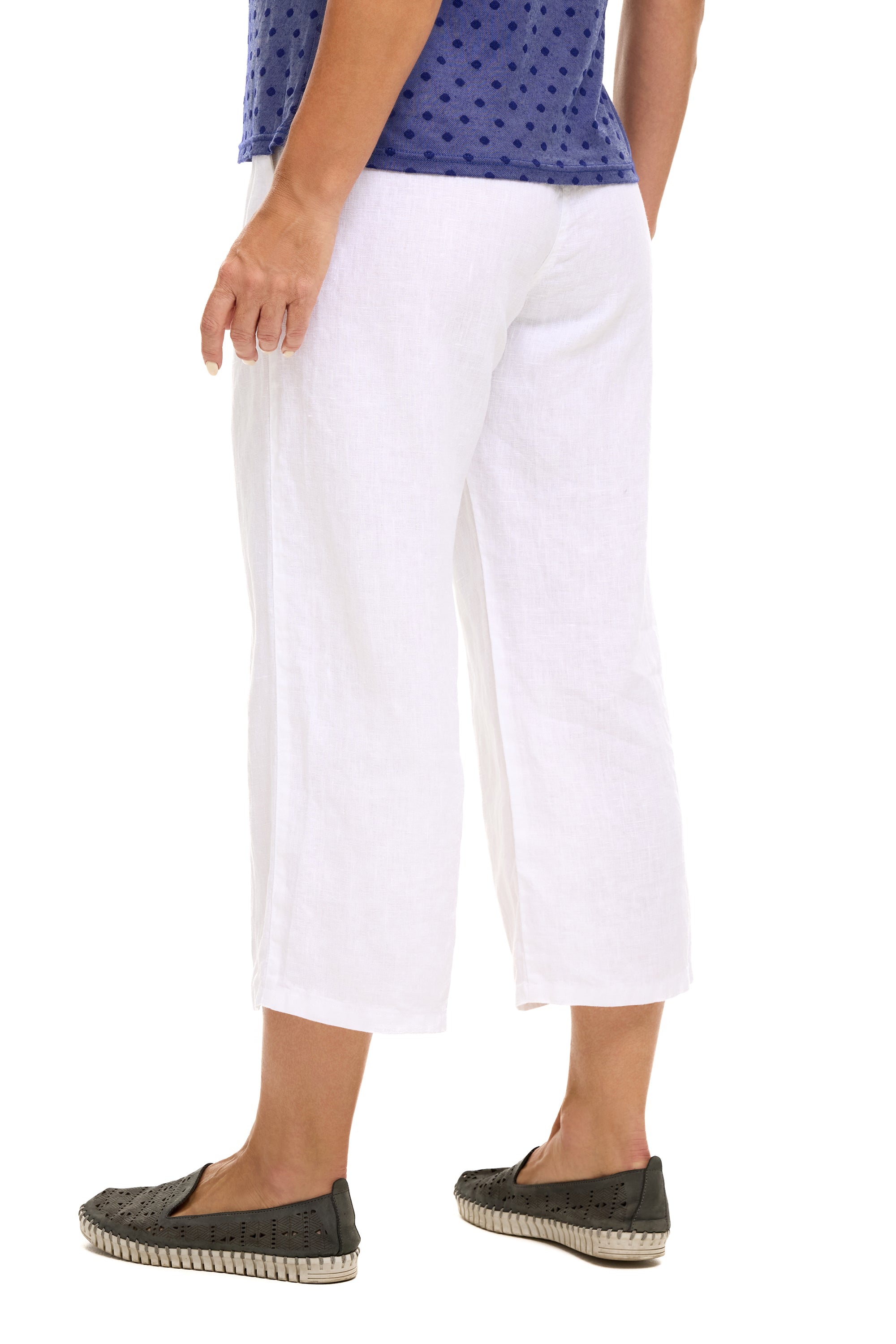 These endlessly versatile 100% linen crop pants are a summer essential, offering a relaxed wide-leg fit with easy pull-on styling. Finished with a faux fly front, stretch waistband, and two slash pockets, they’re comfortably polished and ready to dress up or down.