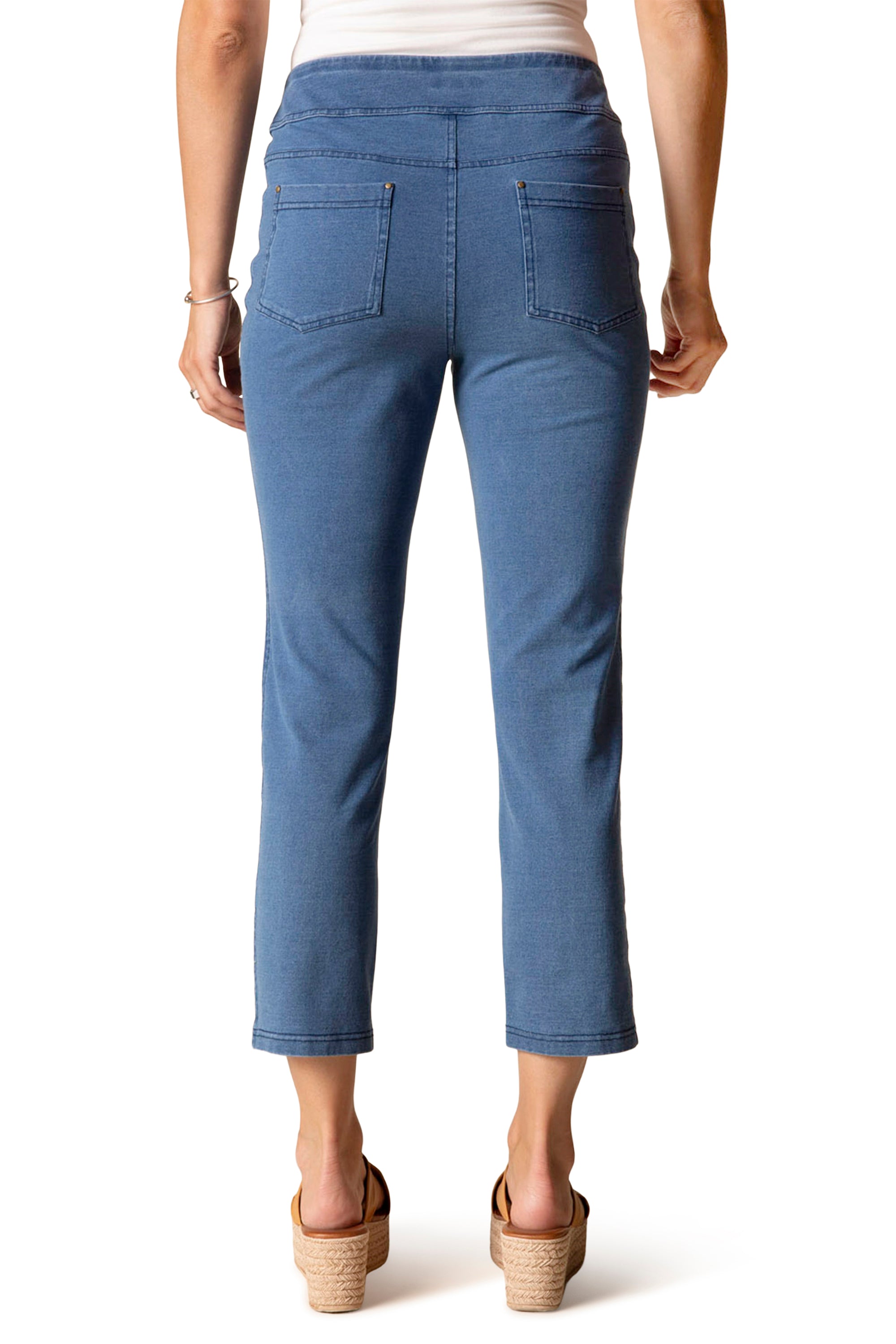 A playful take on classic blue jeans, these capris are crafted from soft knit cotton denim with a hint of stretch for lasting comfort. The five-pocket pull-on design brings timeless styling to everyday wear.