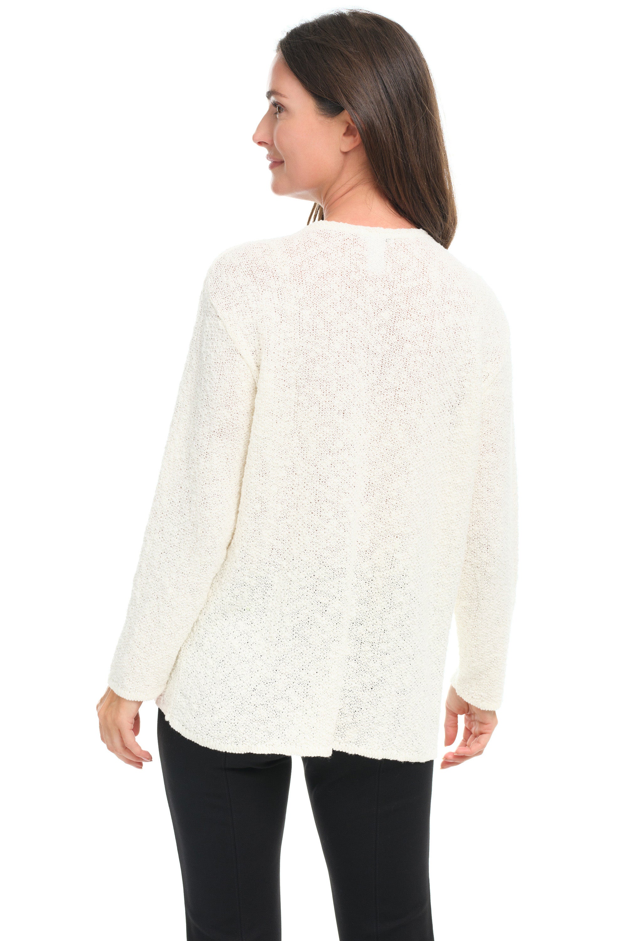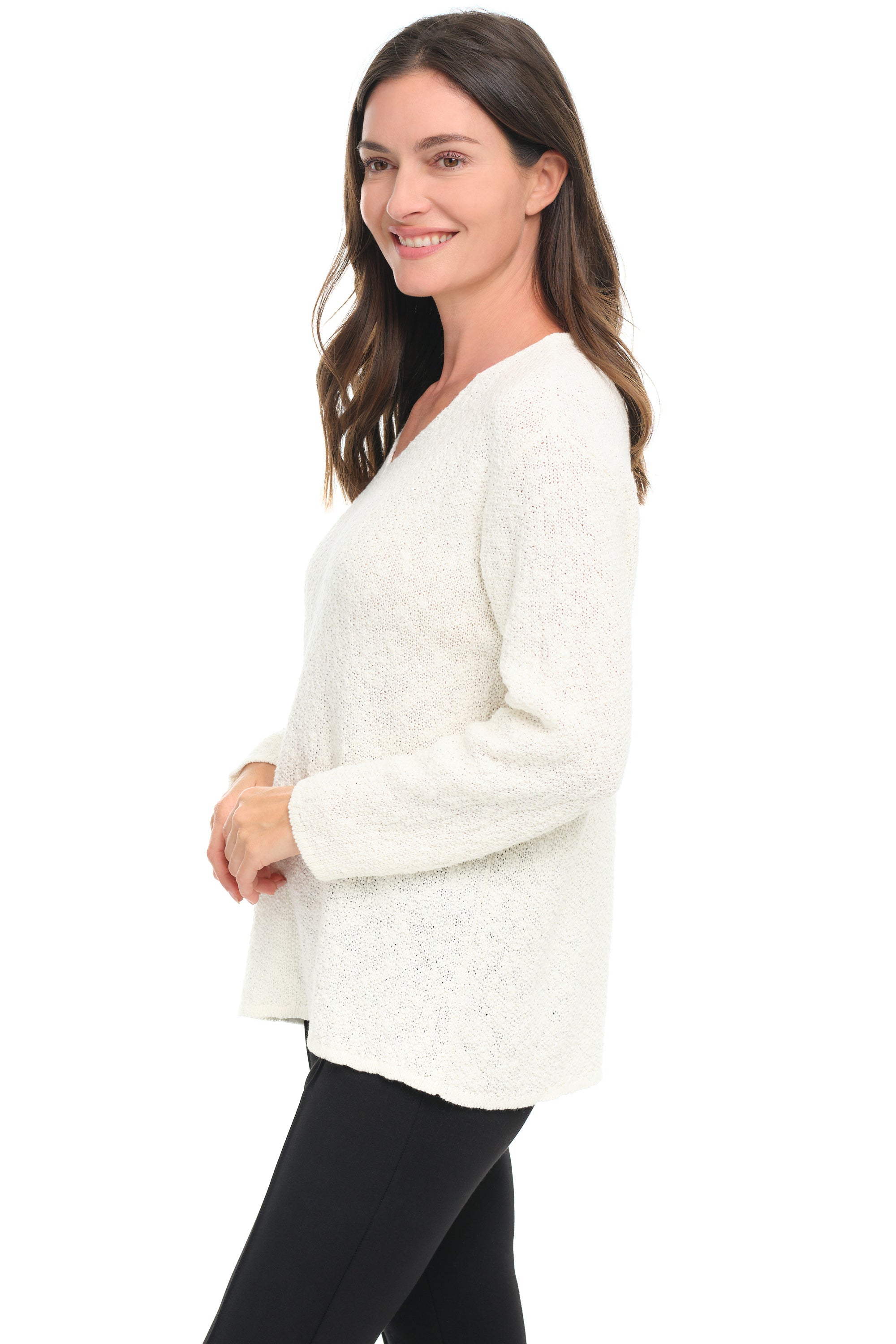 The nubby scramble stitch adds a playful, feminine touch to this versatile sweater. Perfect over a tank, tee, or on its own, this seasonless American-made piece is crafted from 100% slub cotton. The gentle V-neck pullover features long sleeves and a straight hem with narrow ribbing that falls at the hip. Designed with a one-size-fits-most fit, this sweater is an effortlessly charming addition to your wardrobe.