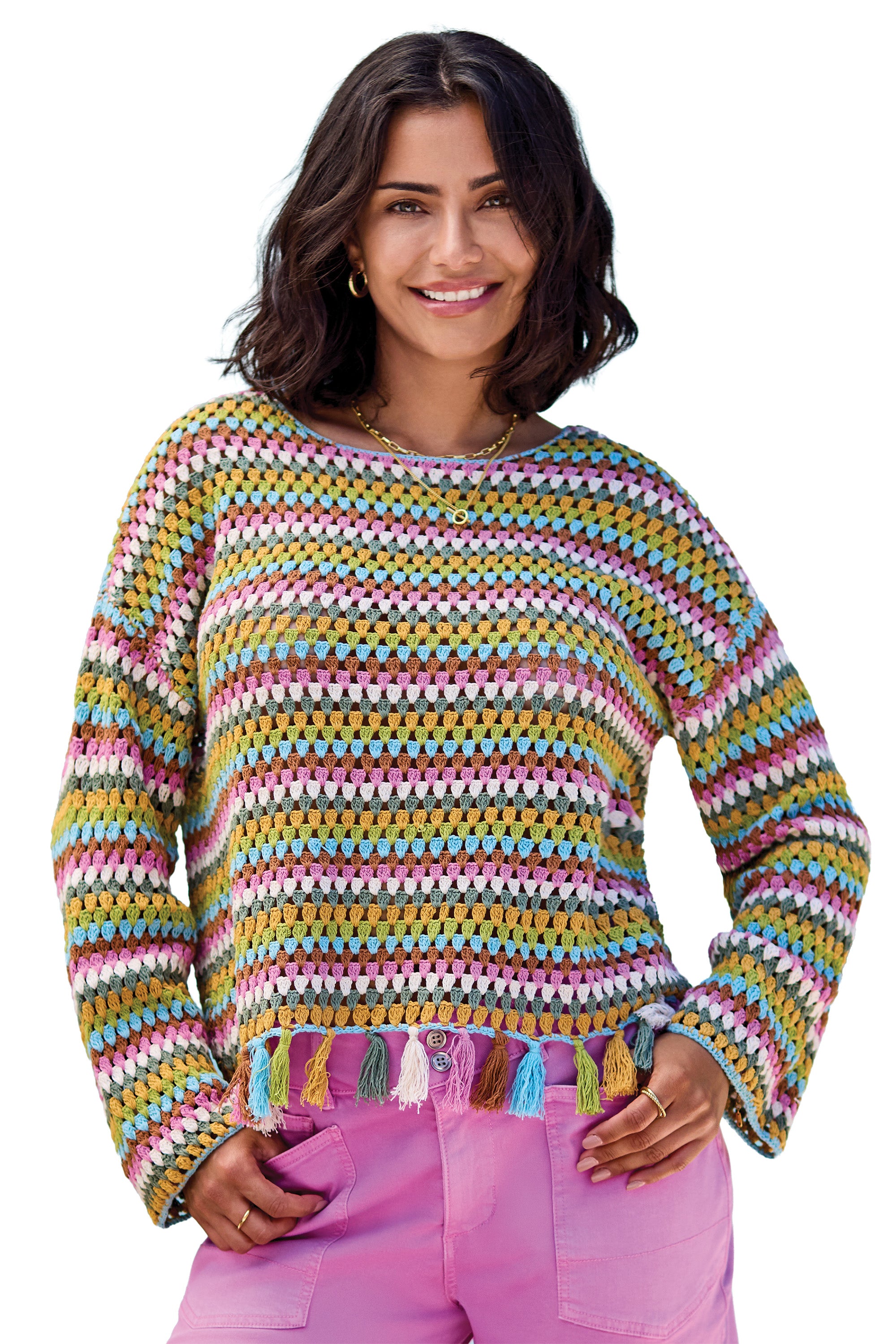 Be sunshine-ready in a retro crocheted pullover in pure cotton, finished with fun tassels and breezy long bell sleeves. Easygoing and playful, it brings a relaxed, laid-back vibe to beach days, boardwalk strolls, and everywhere in between.