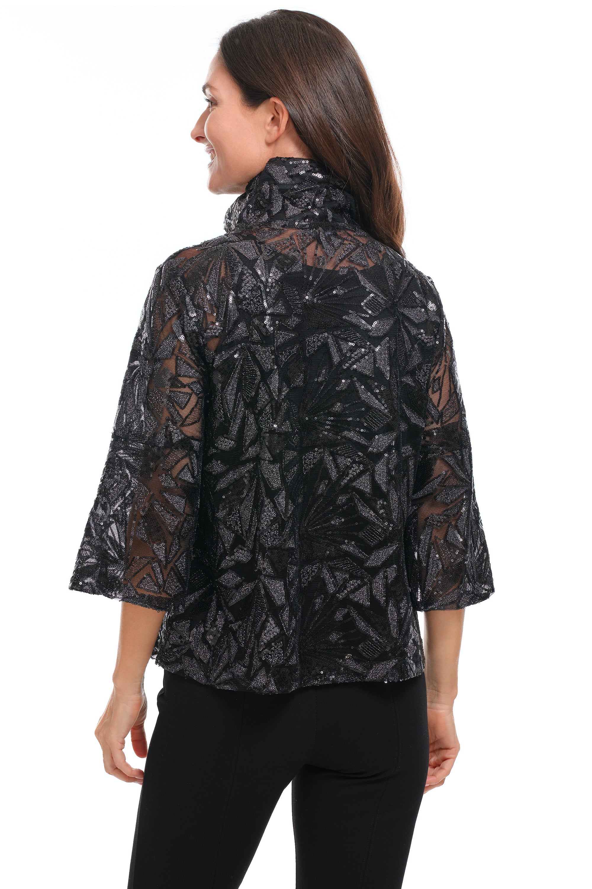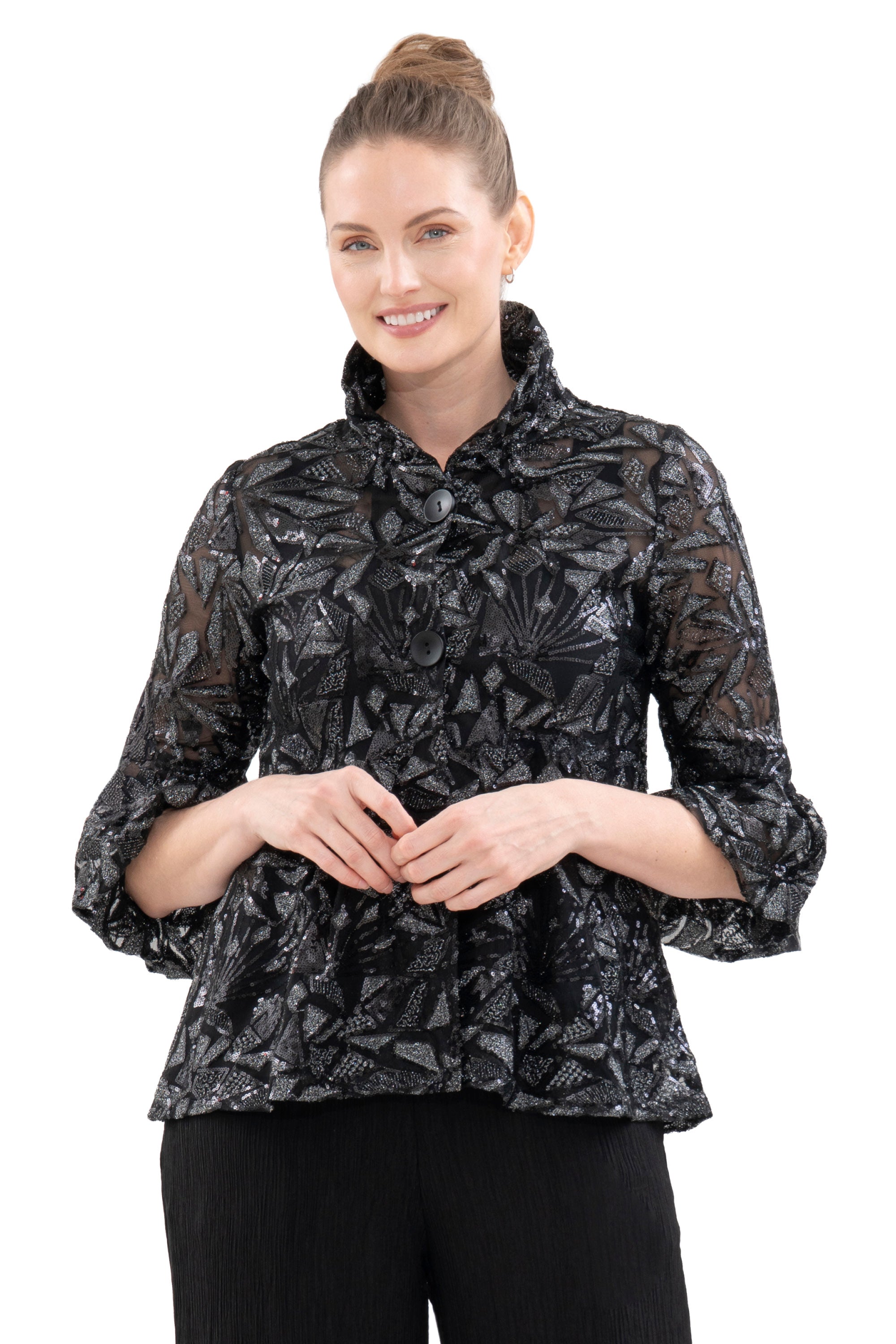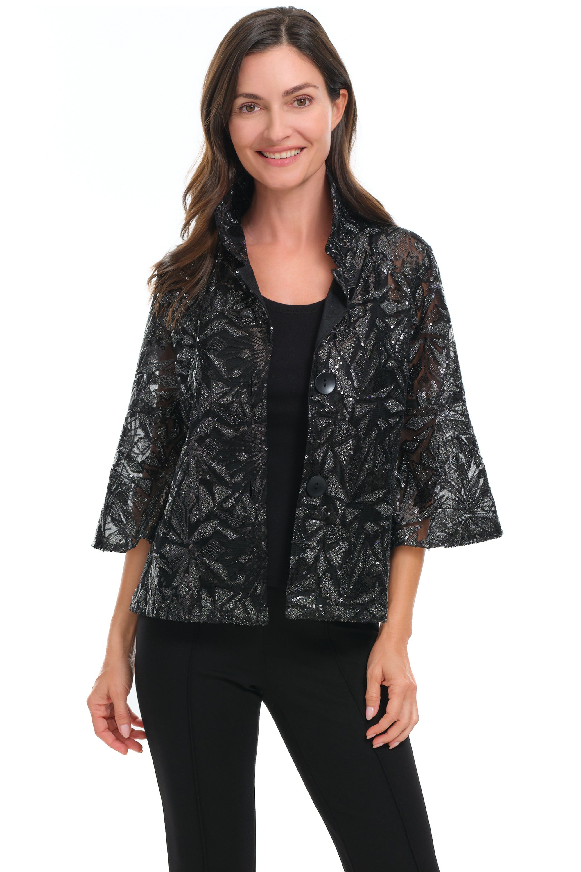 A shimmering special-occasion jacket accented with silver threads and tiny sequins that catch the light. This statement piece features a chic button front and wired collar, semi-sheer and lined with soft poly netting, striking whether worn open or closed.