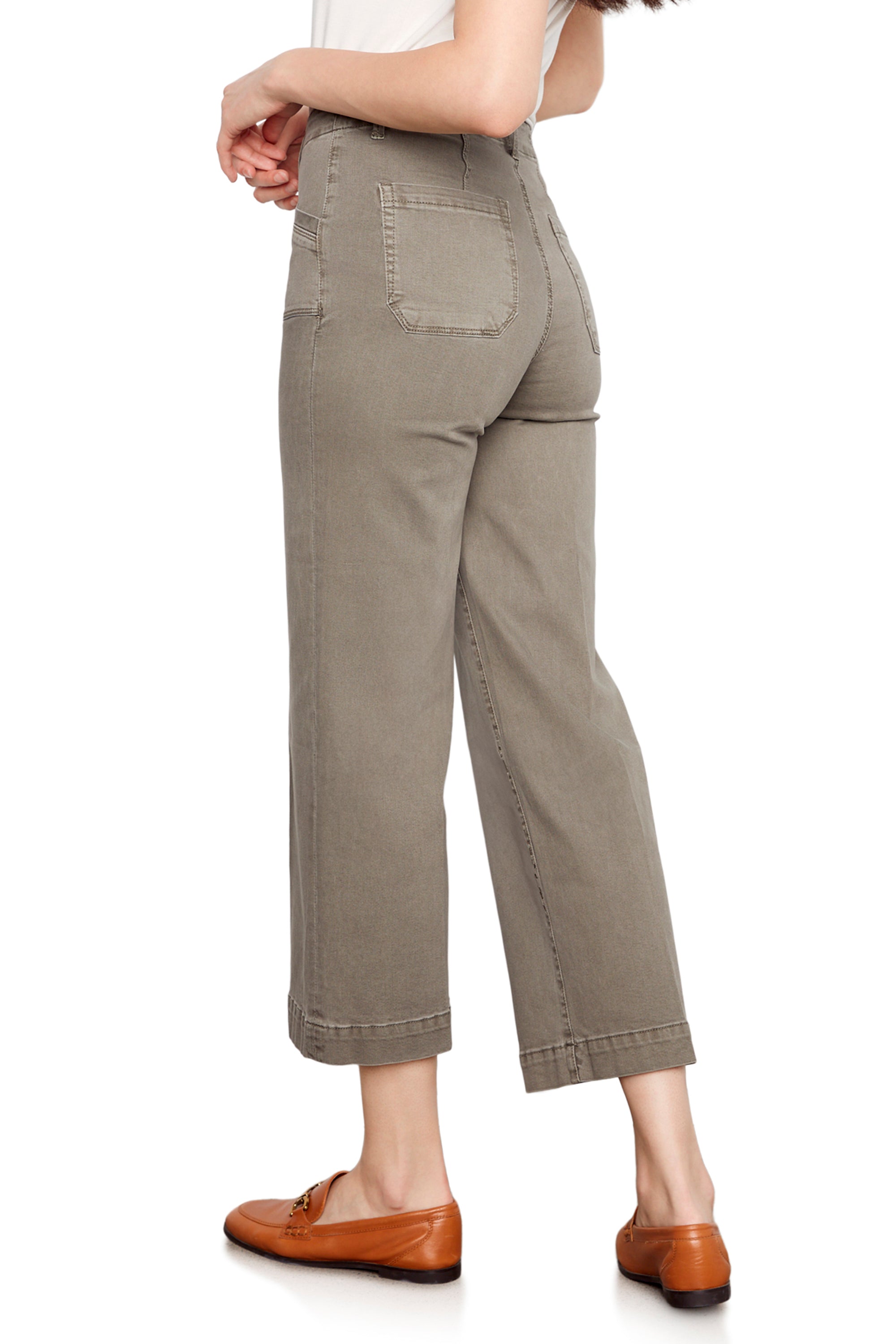 Crafted from comfortable stretch cotton twill, these wide-leg pants offer a flattering drape with all-day ease. Angled front patch pockets and back pockets add utility-inspired detail, while the earthy sage green hue serves as a versatile, wear-with-everything neutral.