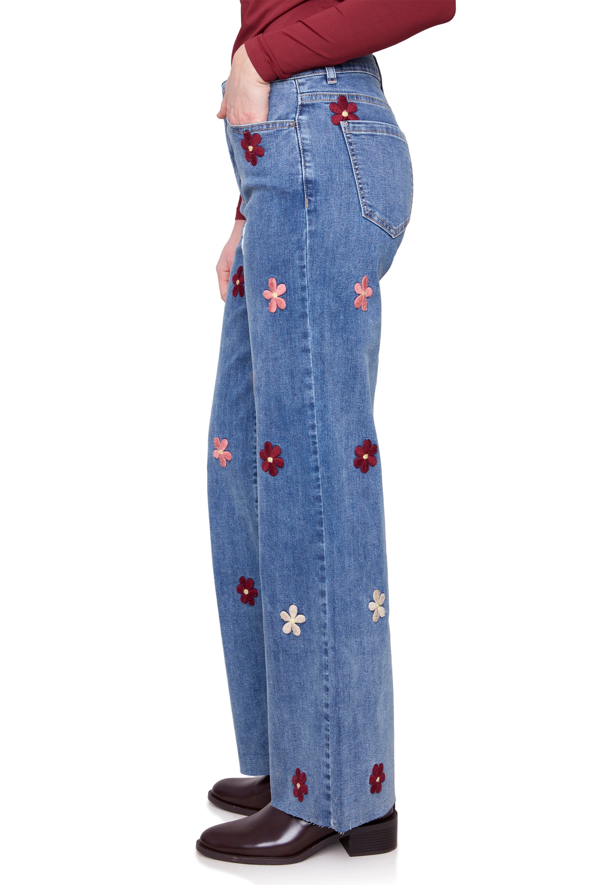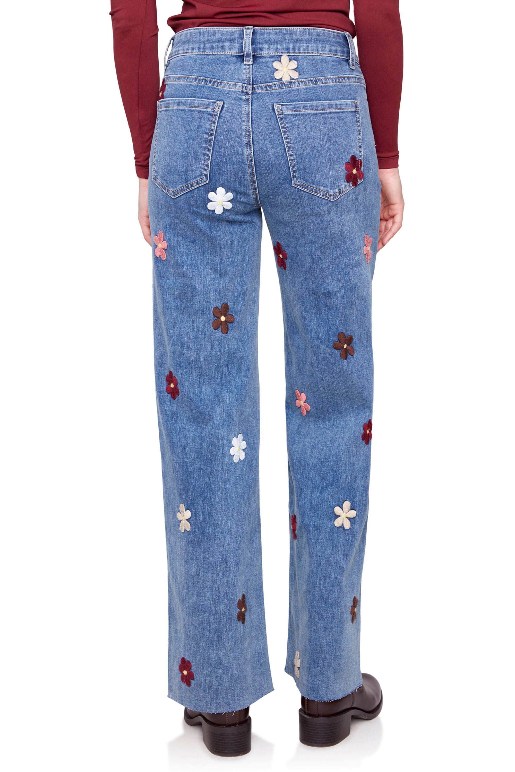 Infuse bohemian elegance into your wardrobe with these medium-wash denim jeans, adorned with embroidered blooms in rose, wine, cocoa, and taupe. Crafted from stretch cotton with a touch of spandex, they mold to your natural shape for a flattering, custom fit. Featuring a raw edged wide-leg silhouette, classic five-pocket design, fly front, and a regular rise that sits comfortably at the natural waist, the 31" inseam creates a graceful, whimsical look that pairs effortlessly with both casual and dressier tops.