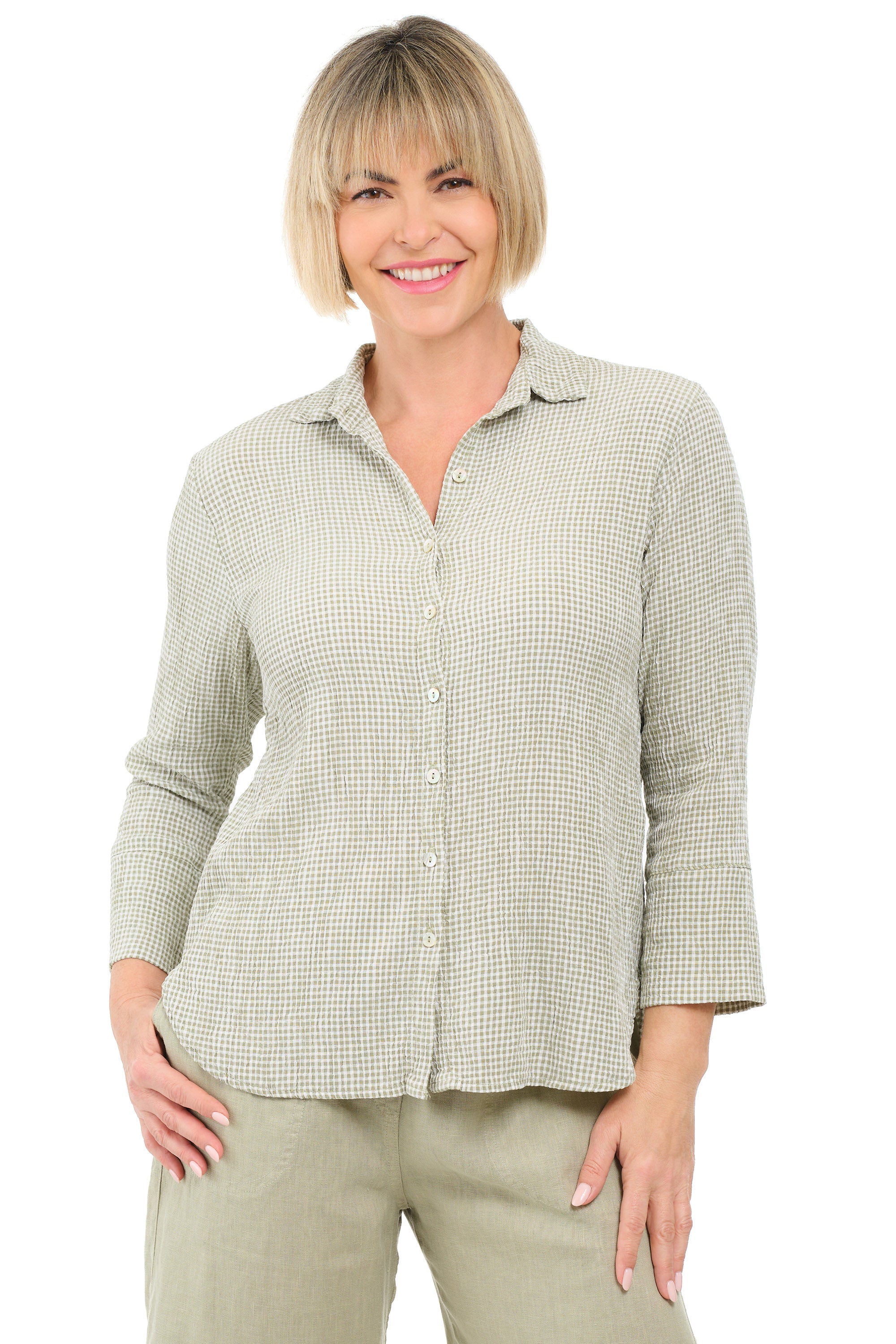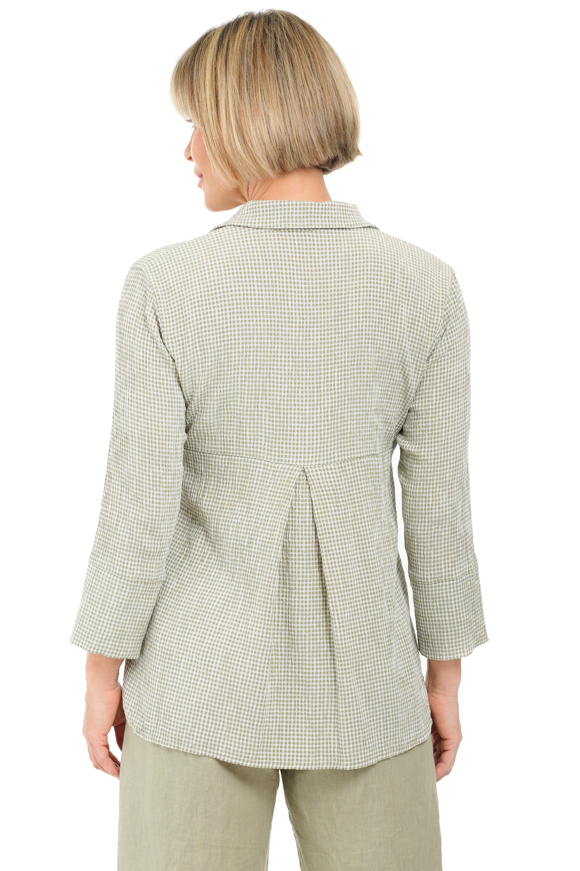 This classic button-front blouse showcases a green-and-white crinkle-checked pattern, bracelet-length sleeves, and an inverted box pleat at the back for a feminine touch. With a rounded hi-lo shirttail hem, it’s versatile and can be styled up with accessories for a polished look.