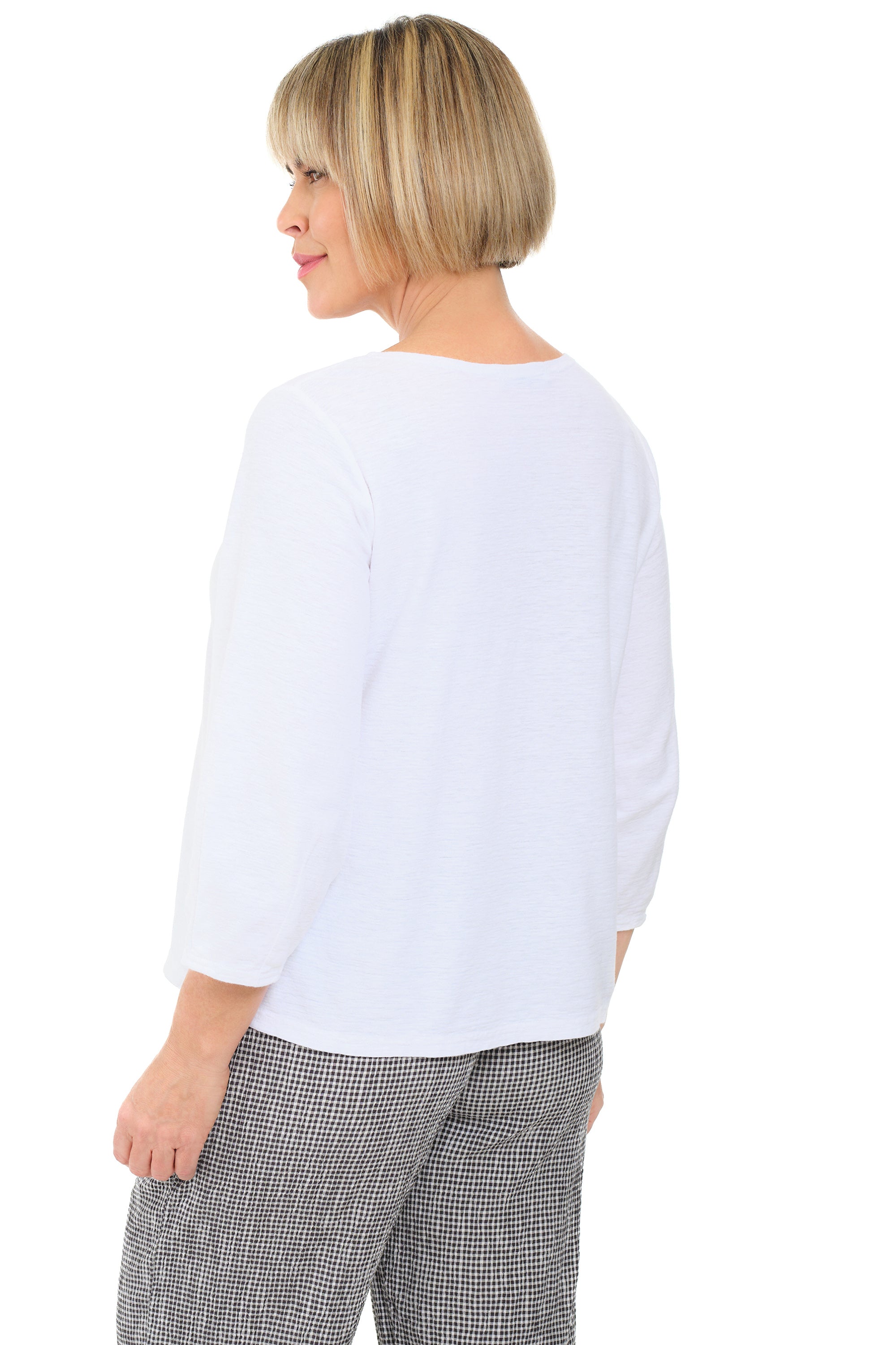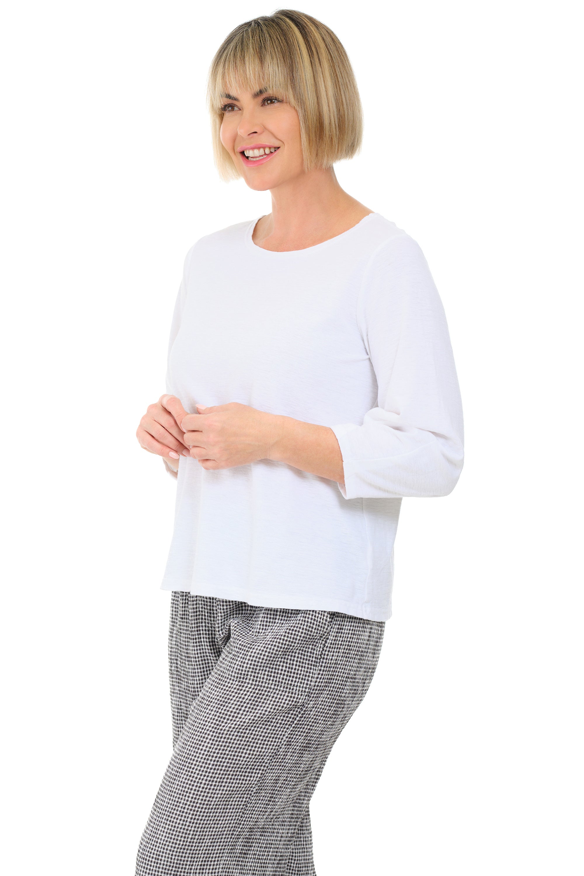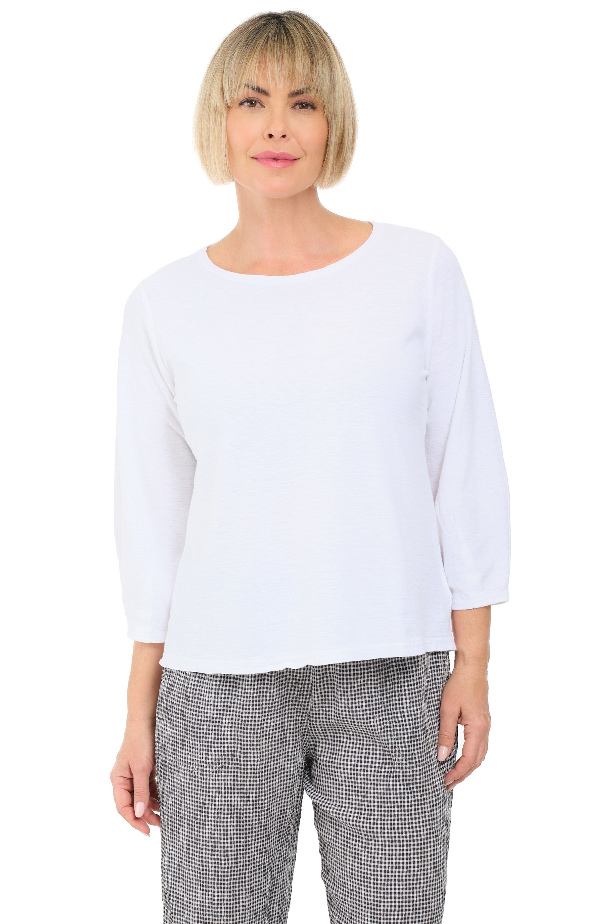 This quintessential white tee is crafted from a breathable linen–cotton jersey blend and features fun full lantern ¾ sleeves that taper at the wrist. Designed with an A-line hem, it’s a versatile pullover perfect for transitioning through the seasons.