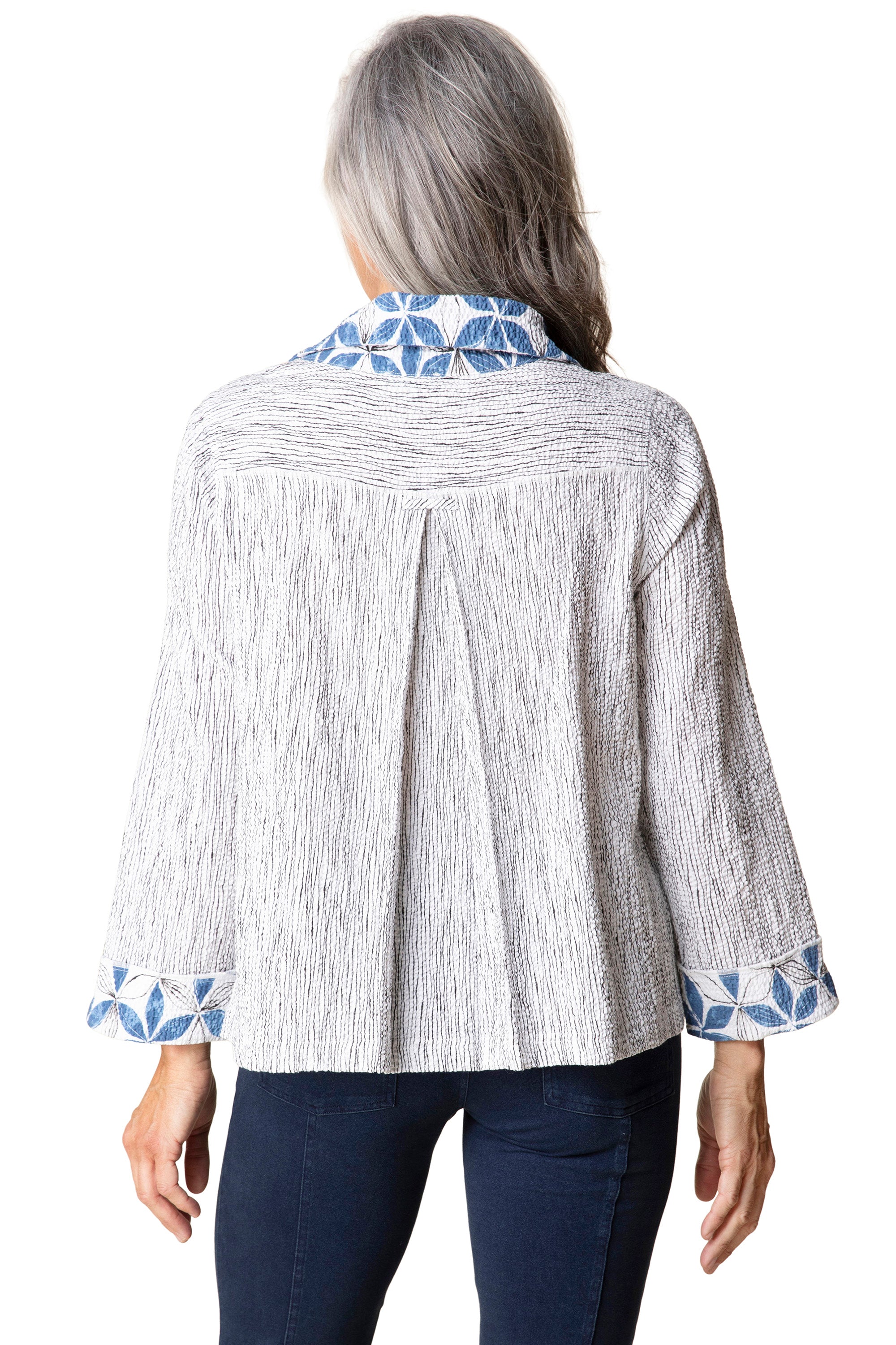 A fresh, artsy take on a classic, this jacket features undulating stripes with a contrasting floral print and two slash pockets. Made from lightly textured crinkled crepe stretch fabric with an adjustable stand collar, it’s a lightweight, versatile, no-iron favorite that’s ready for any occasion.