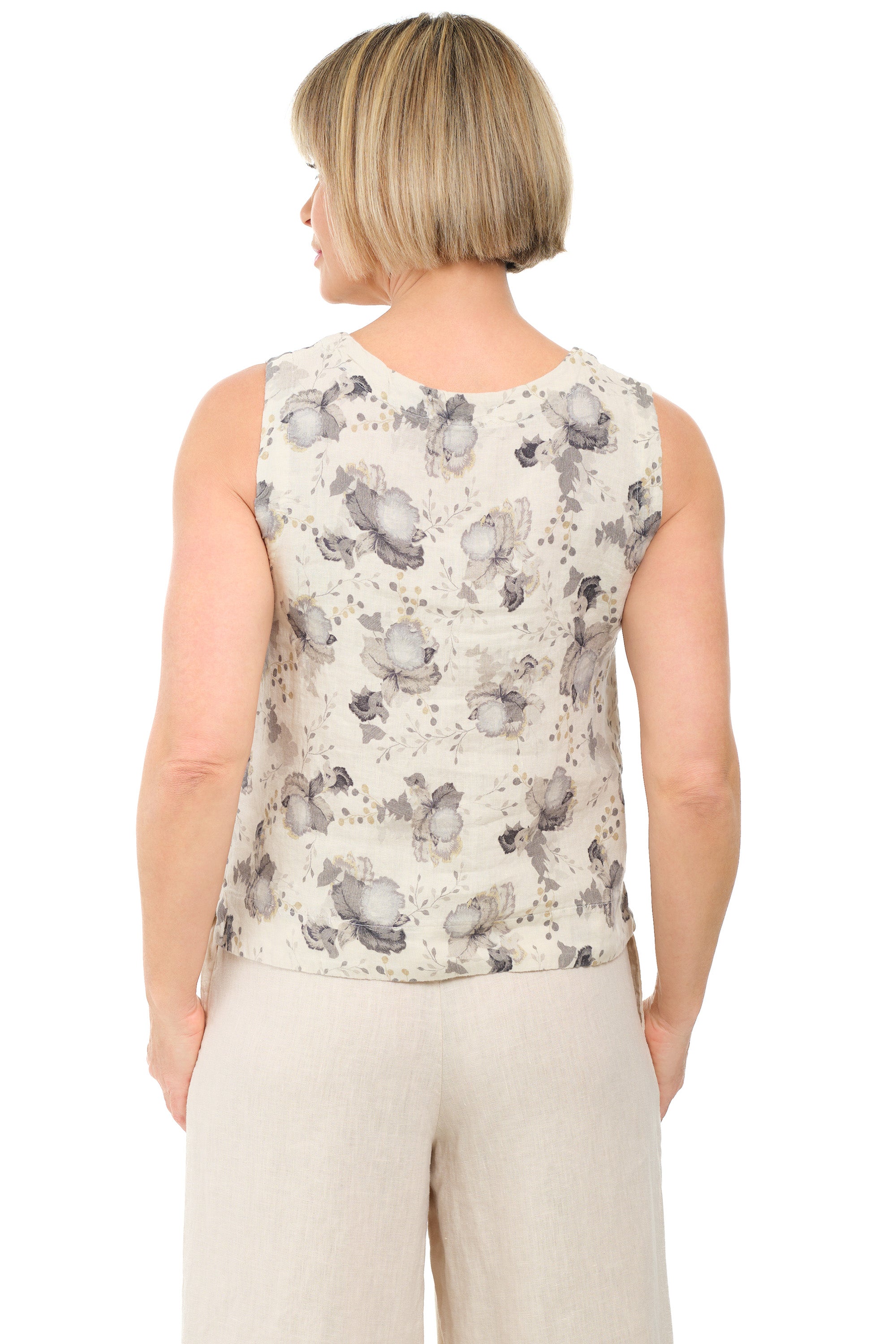 Soft-washed linen showcases a vintage floral print in delicate taupe and grey, bringing understated charm and artistry to this sleeveless pullover tank. A boxy hem with side slits adds a relaxed yet polished finish.
