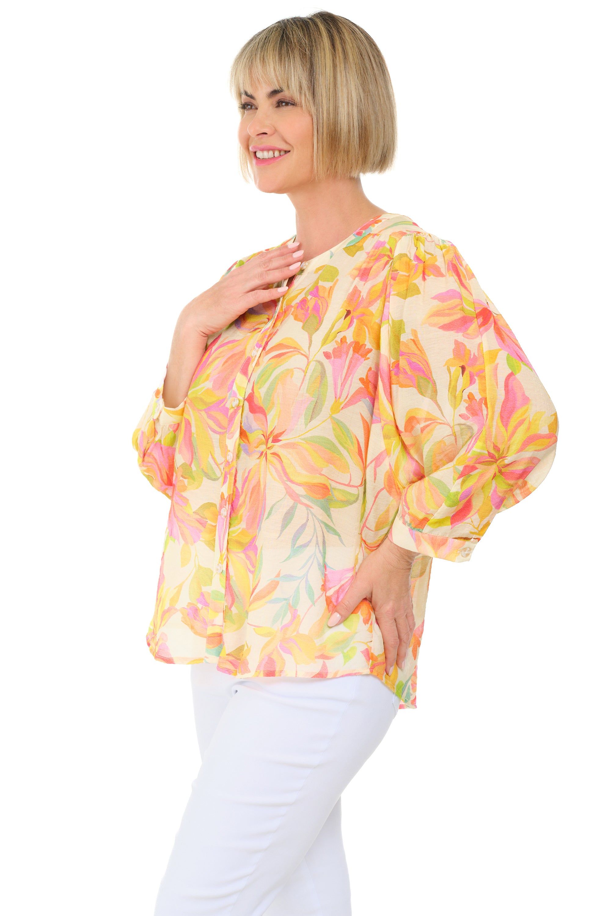 Utterly feminine and lightweight, this semi-sheer floral blouse is styled with a refined band collar and a graceful button front. Soft ¾-length dolman sleeves are gently gathered at the shoulders and wrists with buttoned cuffs, while a boxy silhouette and rounded hem create an airy, flowy fit.