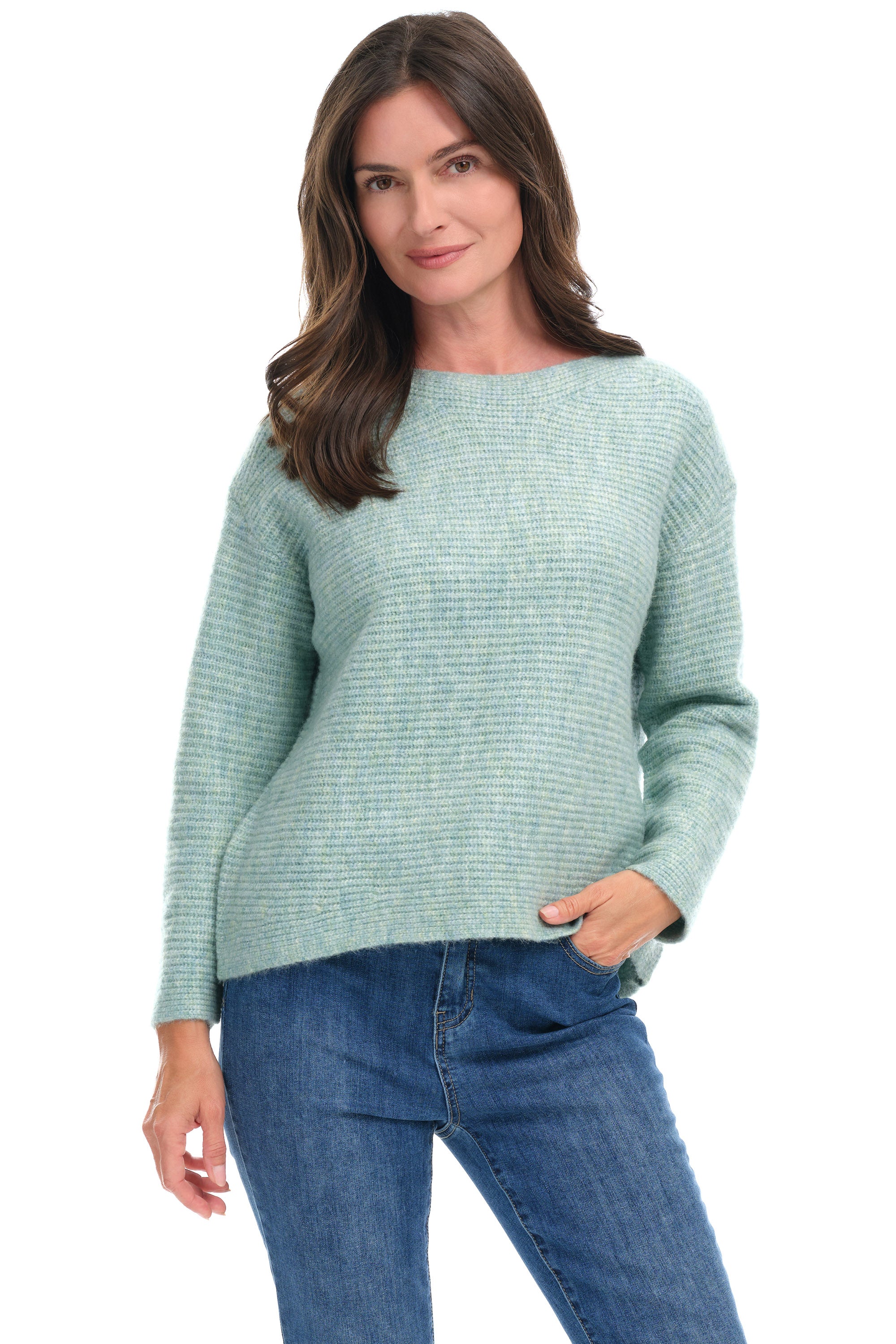 This heathered oat pullover in soft seafoam green offers a luxuriously cozy feel. Crafted from a soft wool blend, it features a classic boatneck, relaxed dropped shoulders, and a subtle horizontal rib pattern for understated texture. Long sleeves and a straight, boxy hem that falls at the hip create a versatile, effortlessly flattering silhouette—perfect for pairing with casual jeans or tailored trousers. A timeless wardrobe essential with a quiet, cozy sophistication.