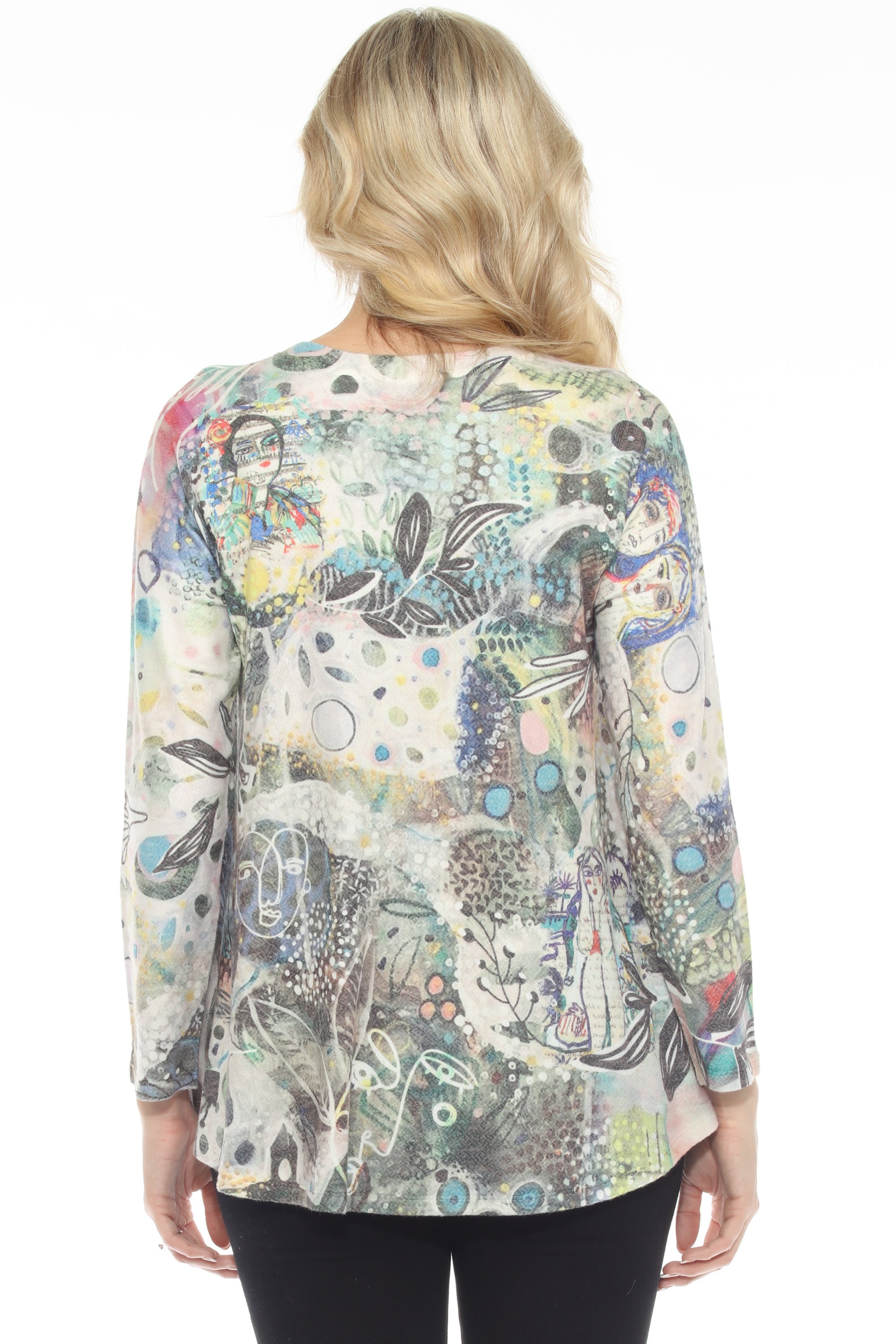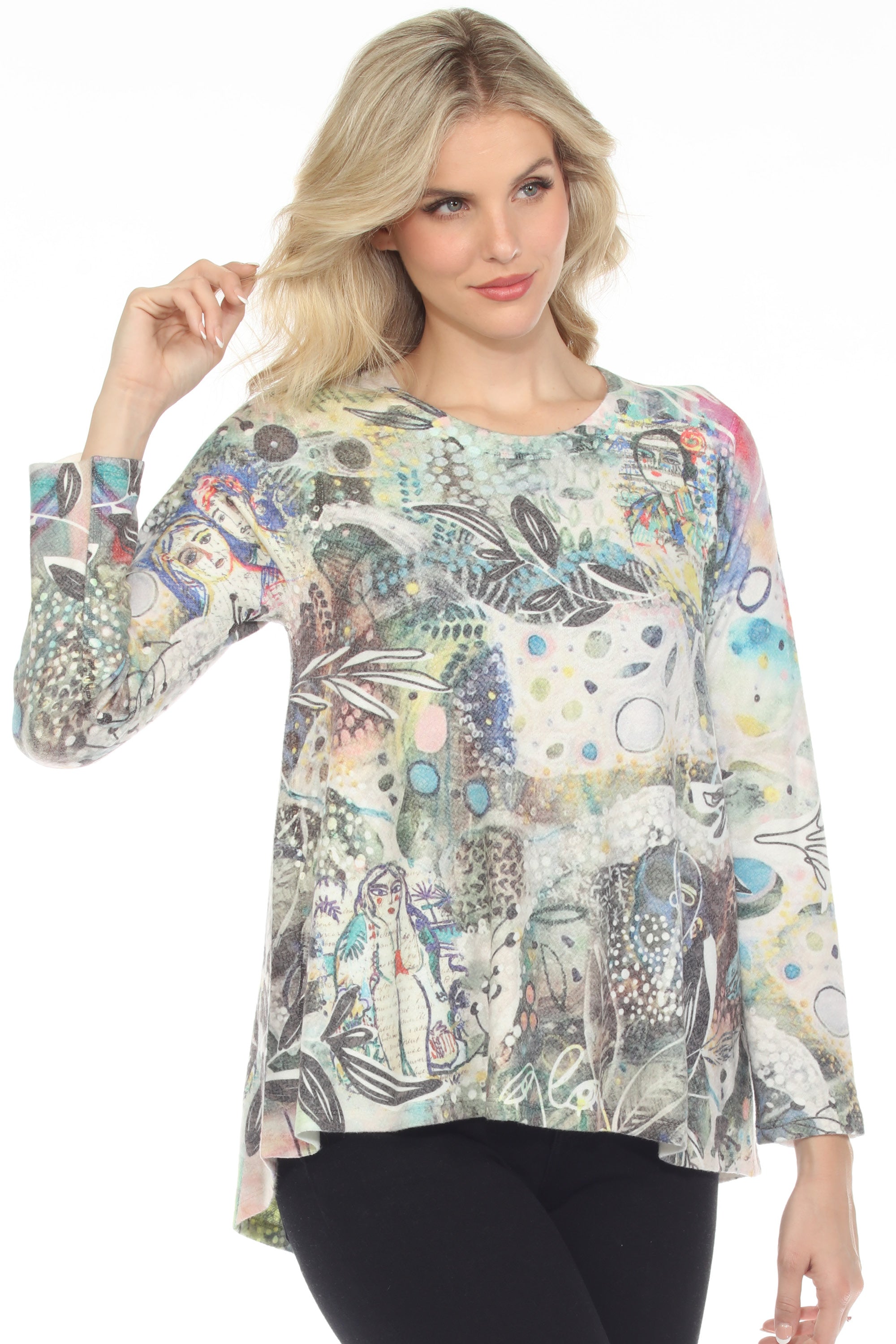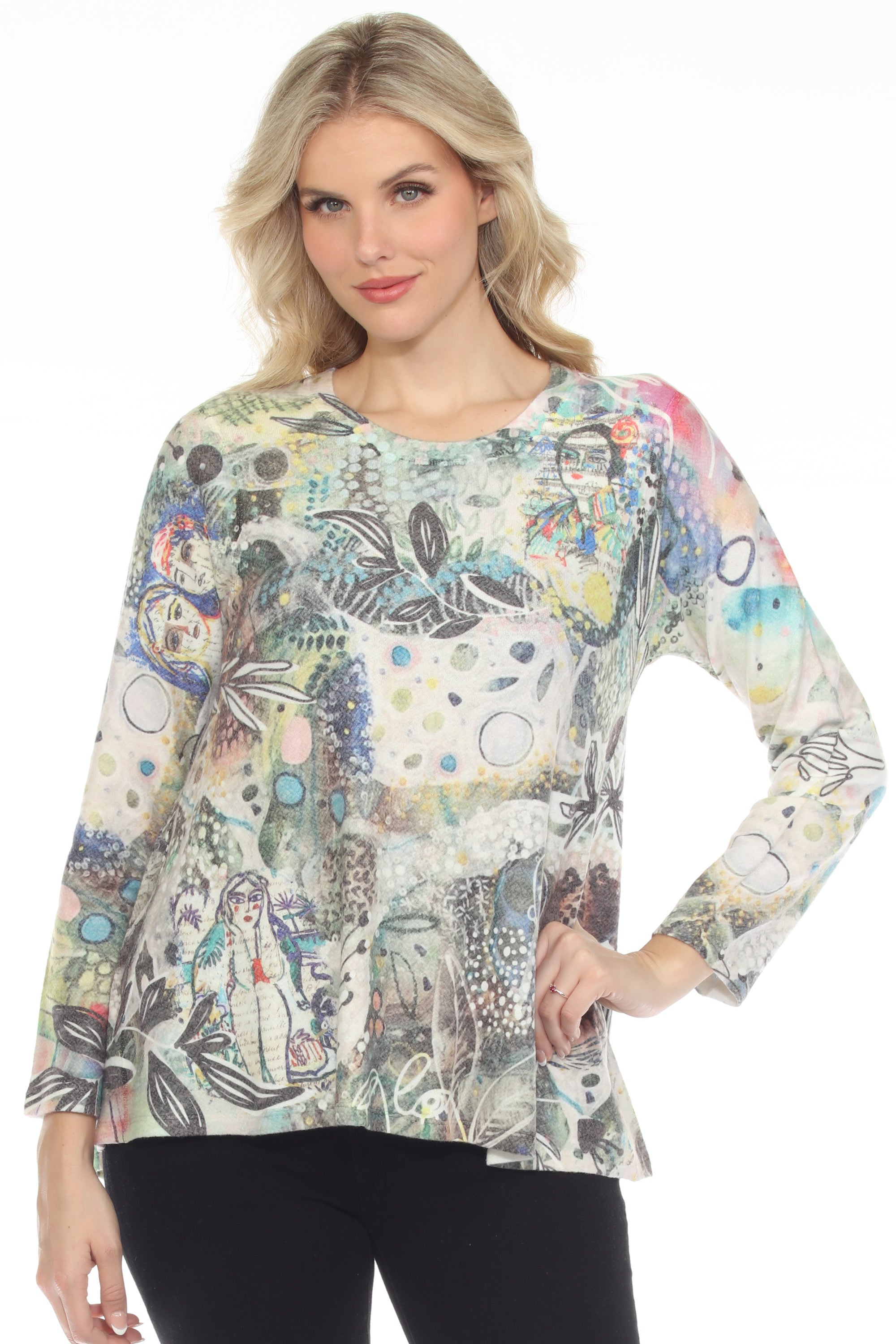 Find comfort and creativity in this scoop neck pullover, featuring a whimsical collage of botanicals and faces in serene, muted pastels. Made from soft stretch brushed jersey, it’s cozy and inviting. Long sleeves and a hi-lo swing hem that falls below the hip create relaxed, flowing movement. A playful piece of wearable art, perfect for layering, pairing, and taking your style wherever life leads.