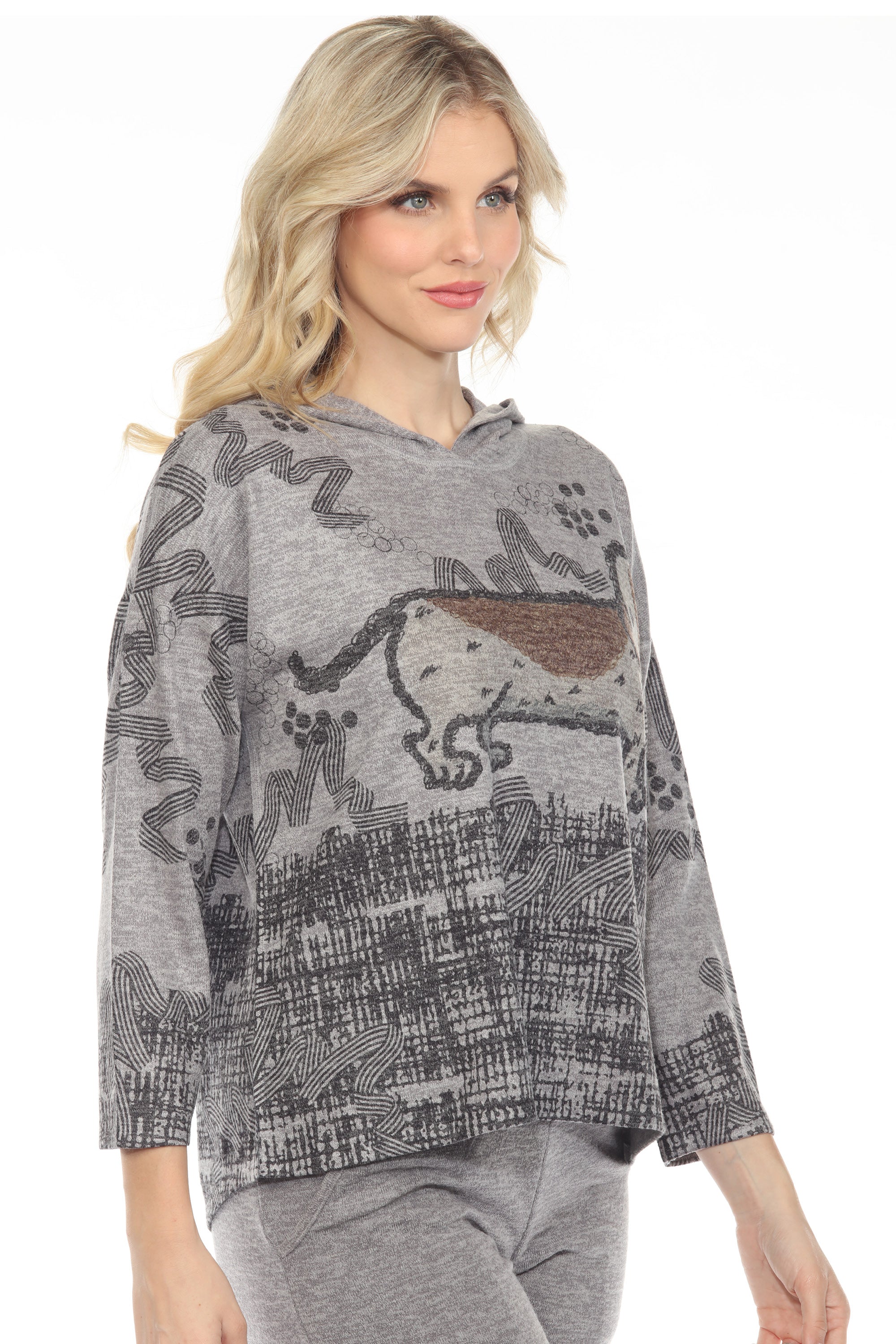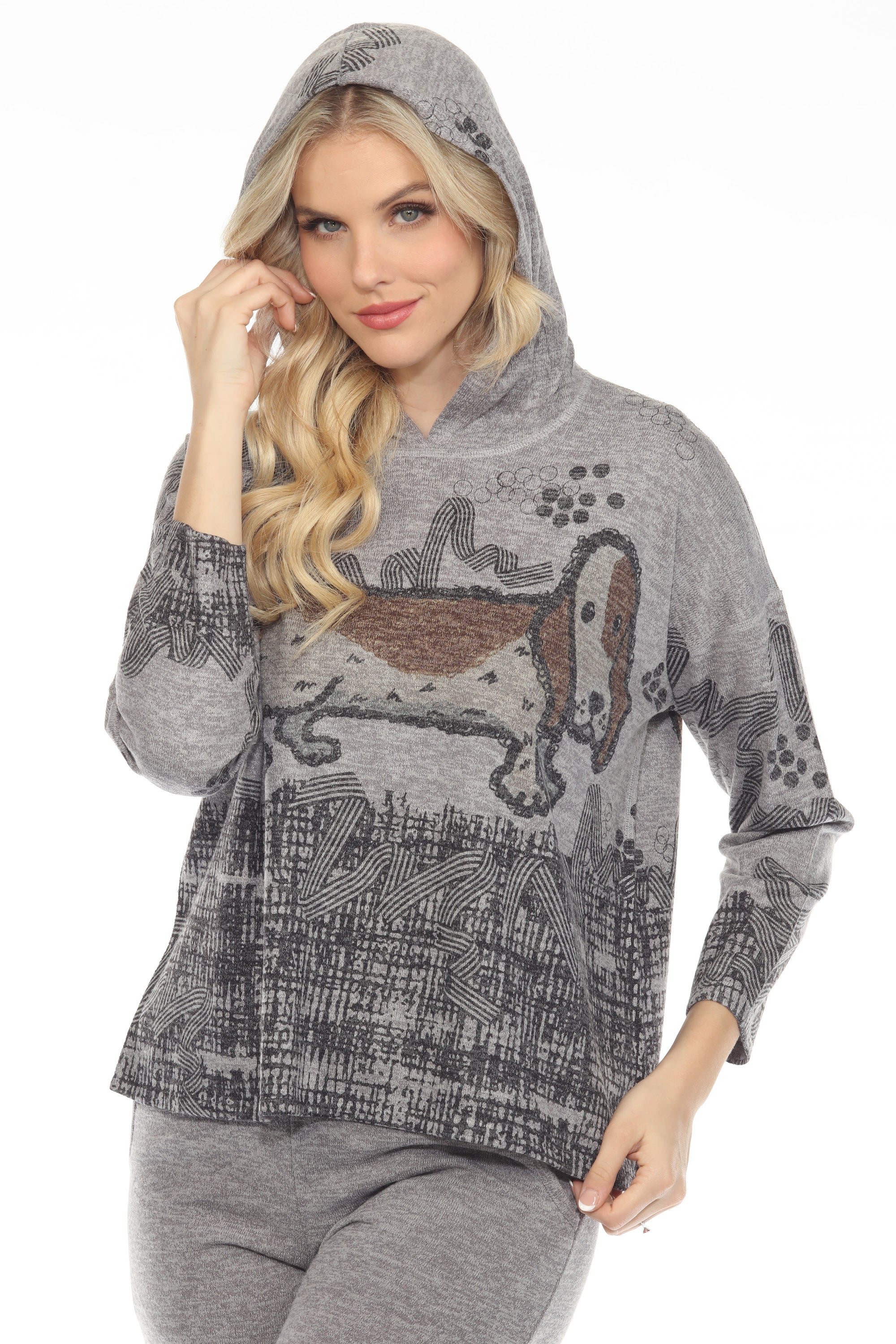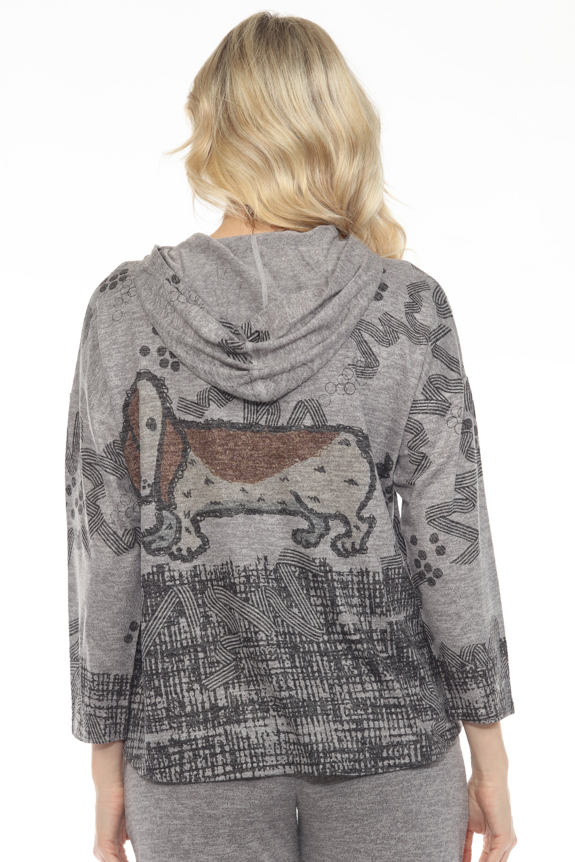 Serious hound, not-so-serious style. This playful pullover shows off a doodle-inspired basset hound surrounded by whimsical graphic sketches, bringing instant personality to your look. Made from soft stretch heathered jersey, it features a relaxed hood, dropped shoulders, and long sleeves for laid-back comfort. The oversized, unstructured fit with a subtle hi-lo hem at the hip makes it the perfect mix of cozy and quirky. In true Inoah fashion, it’s wearable art made for everyday fun, travel, and a touch of mischief.