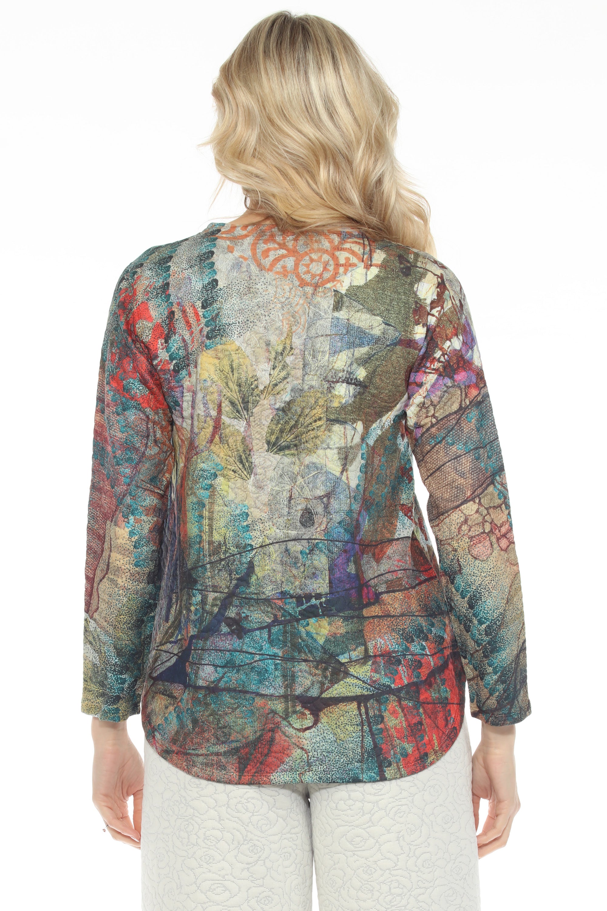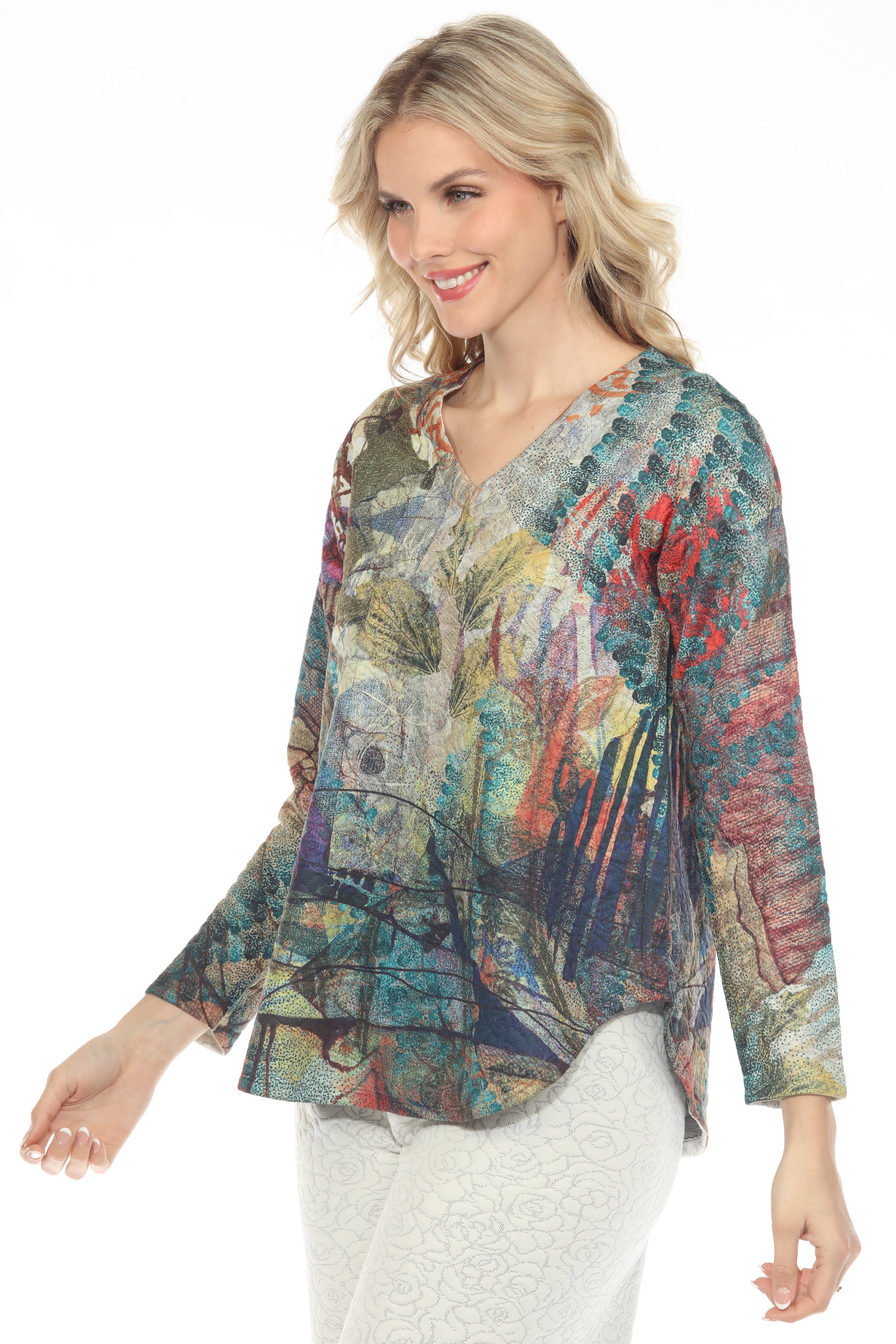 Wrap yourself in comfort and creativity with this V-neck pullover, crafted from soft stretch quilted knit jersey. An expressive mix of botanicals and graphic motifs comes alive in a palette of vibrant fall hues balanced by earthy undertones. With long sleeves and a rounded hem that drapes below the hip, its relaxed silhouette makes it ideal for layering, pairing, and traveling. A cozy essential with an artistic spirit, it brings a subtle touch of fall-inspired flair to everyday style.