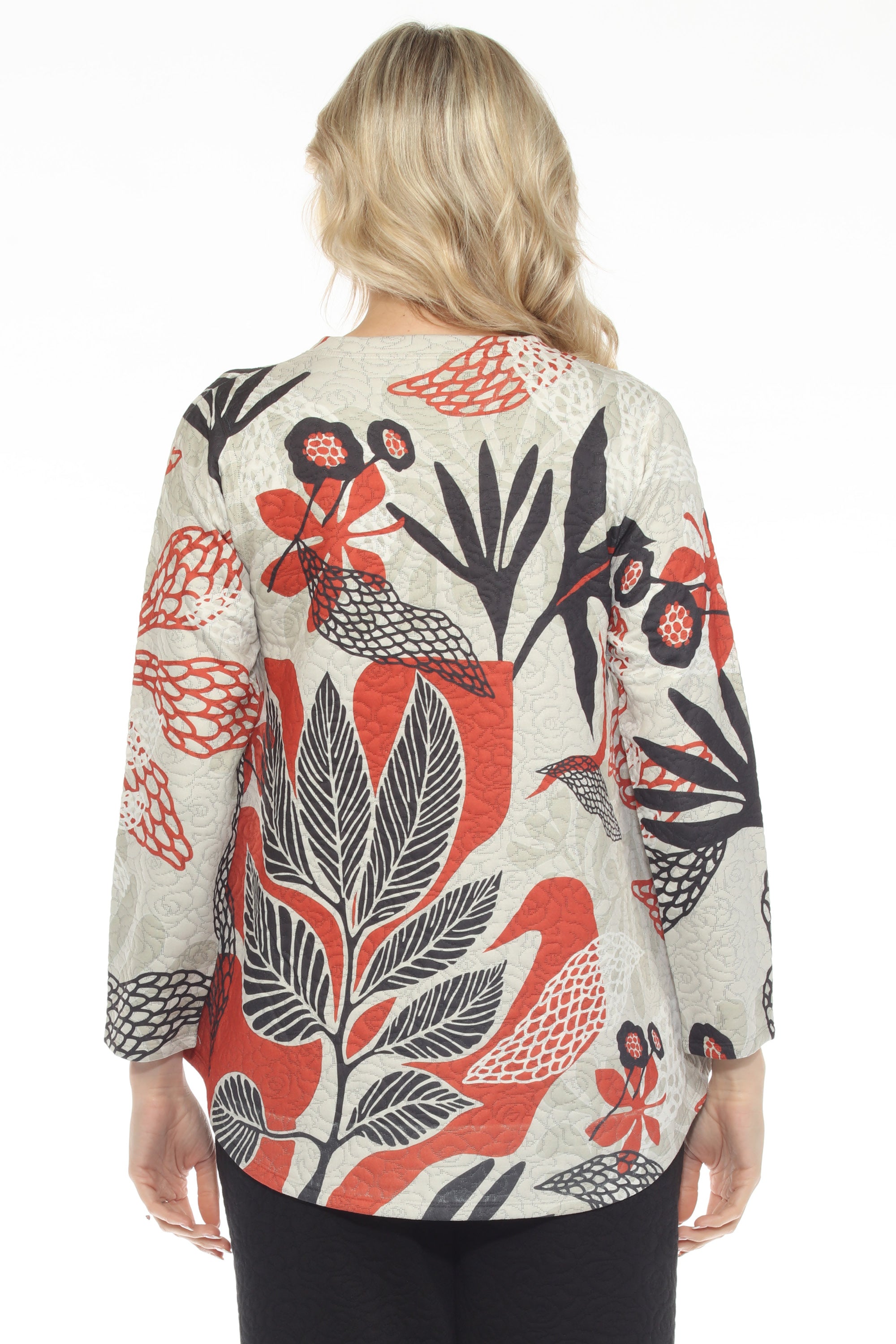 Step into autumn with a playful twist in this scoop neck pullover, alive with bold, earthy-toned botanical graphics. Crafted from soft, stretch quilted knit jersey, it’s cozy, colorful, and full of creative flair. Long sleeves and a swingy hi-lo hem that falls below the hip make it perfect for layering, while the relaxed silhouette keeps it effortlessly fun. A piece of wearable art that adds a little sparkle to everyday dressing and travels beautifully wherever the season takes you.