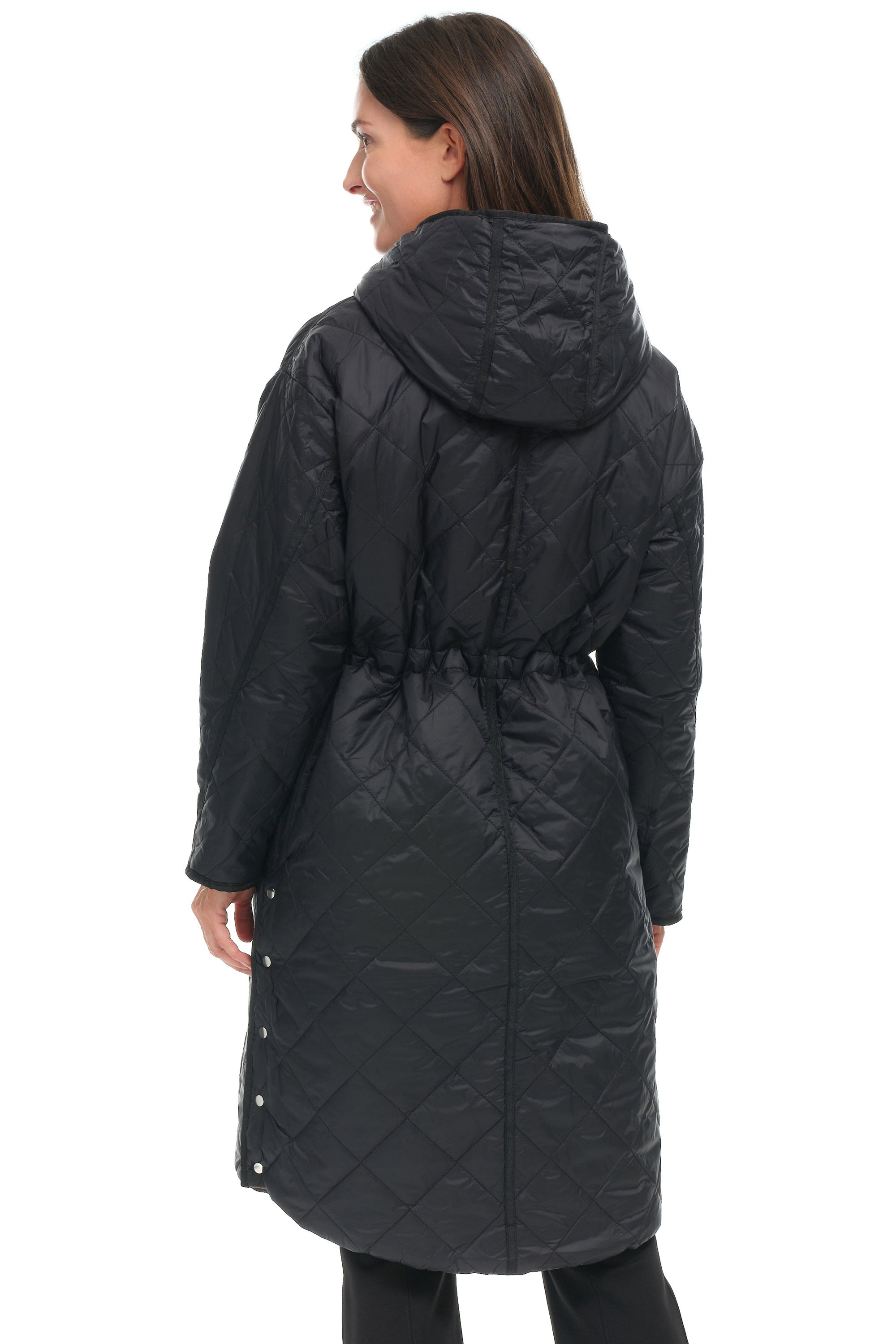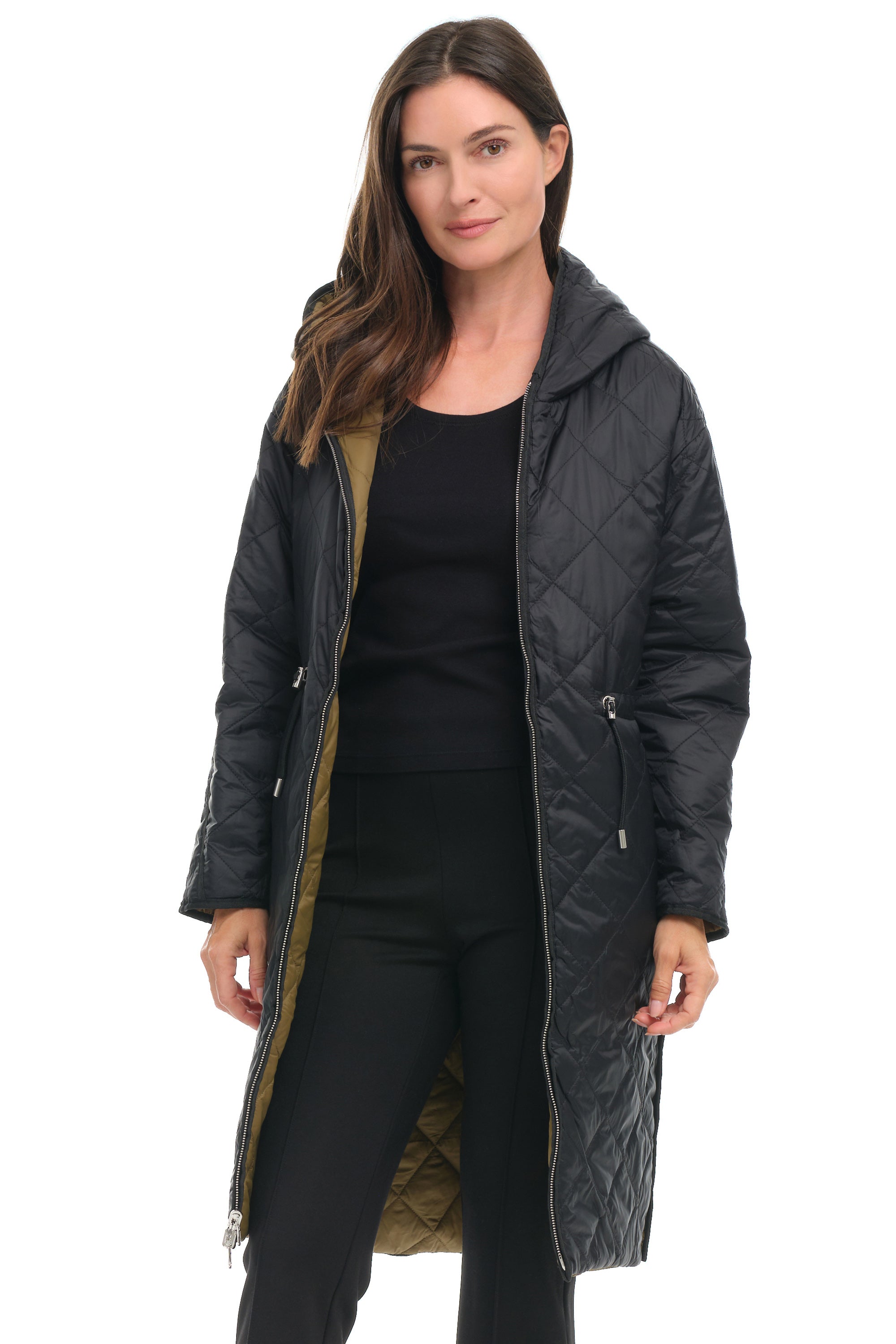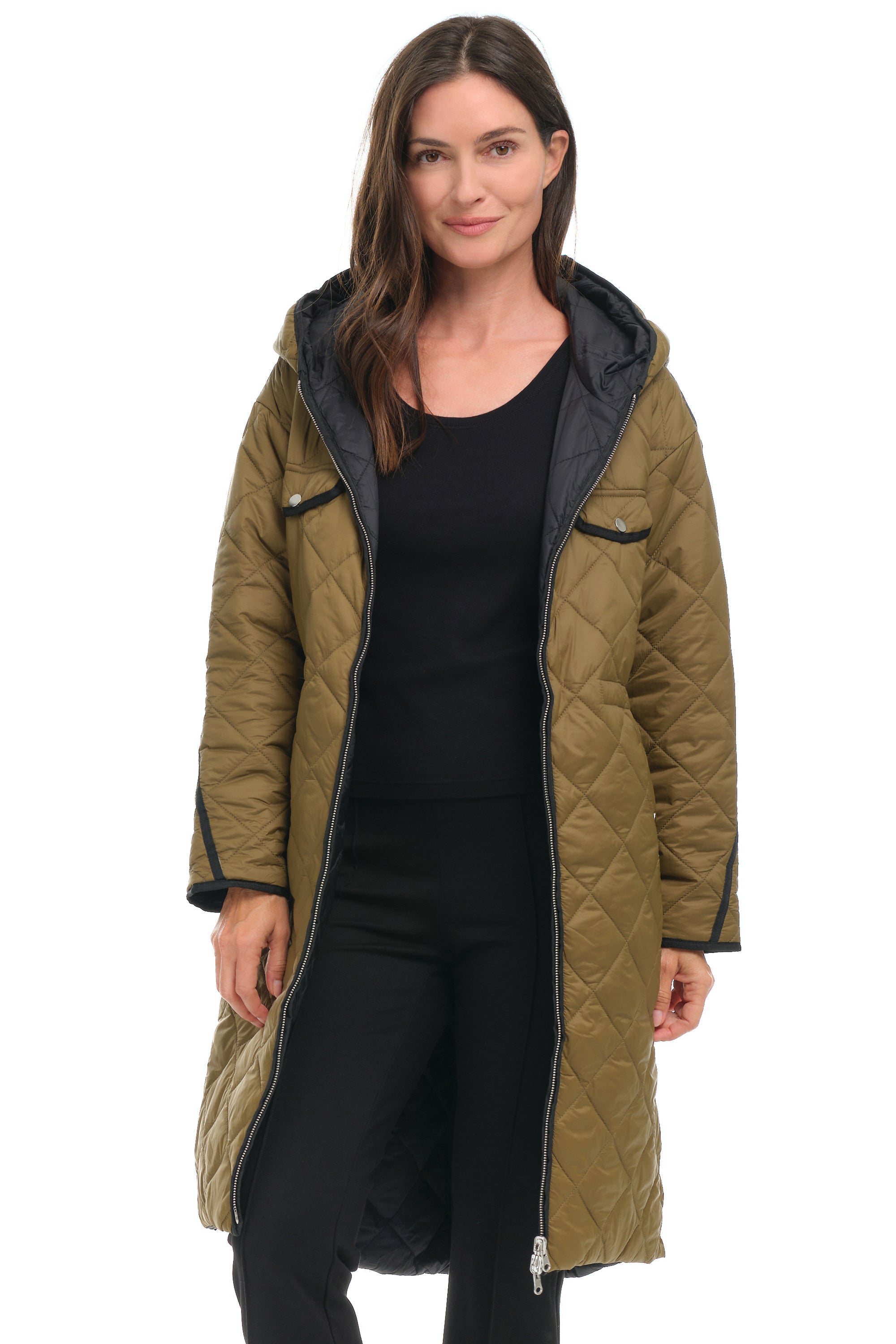 A modern twist on classic winterwear, this diamond-quilted puffer coat combines style and versatility. In deep ivy with black accents, it reverses to sleek solid black, offering two distinct statements in one. The zip-front closure, adjustable waist, and two-way zipper ensure a tailored, functional fit, while side-seam snaps and a cozy hood add thoughtful detailing. With pockets on both sides and a straight hem falling below the hip, this coat merges contemporary edge with practical elegance.