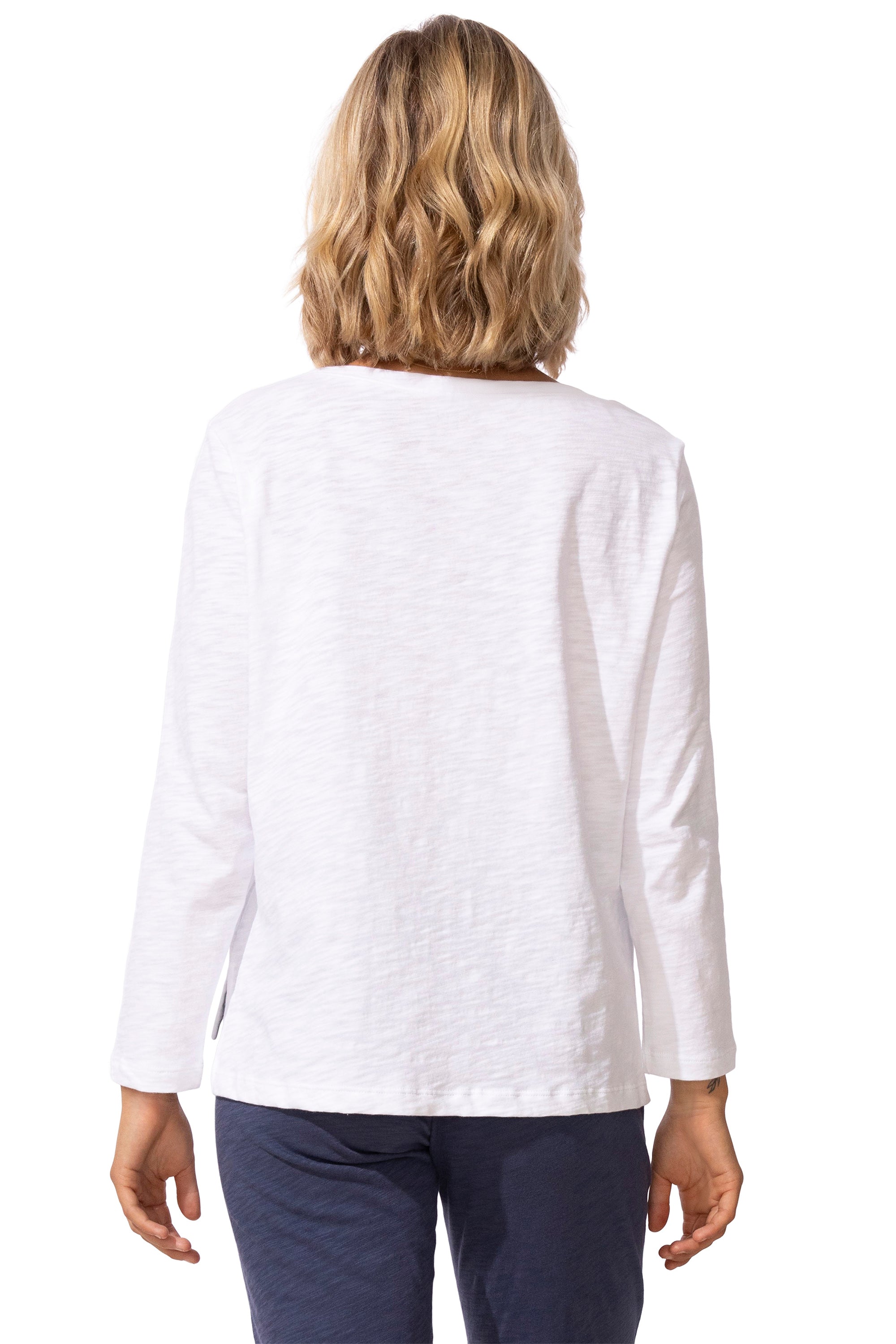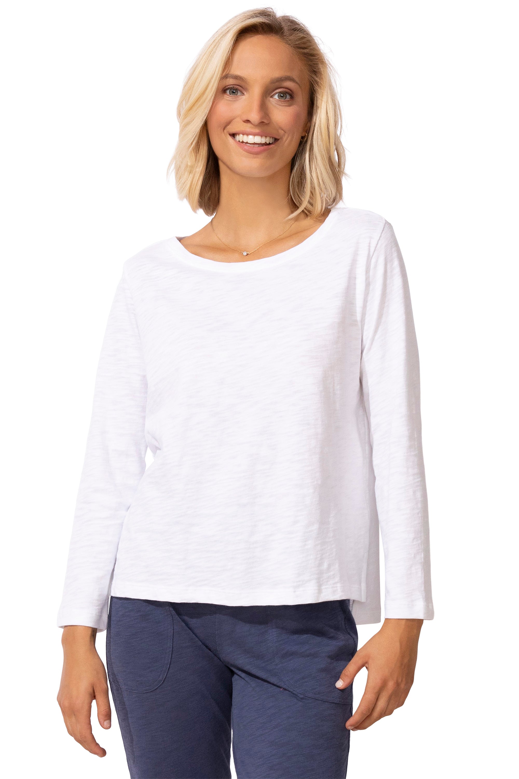 A versatile, multi-season pullover crafted from the finest Peruvian cotton jersey, prized for its softness, durability, and strength, with slub-textured yarns creating a unique, nuanced finish. A graceful boat neckline, bracelet-length sleeves, and a relaxed boxy silhouette with a hi-lo notched hem lend modern ease.