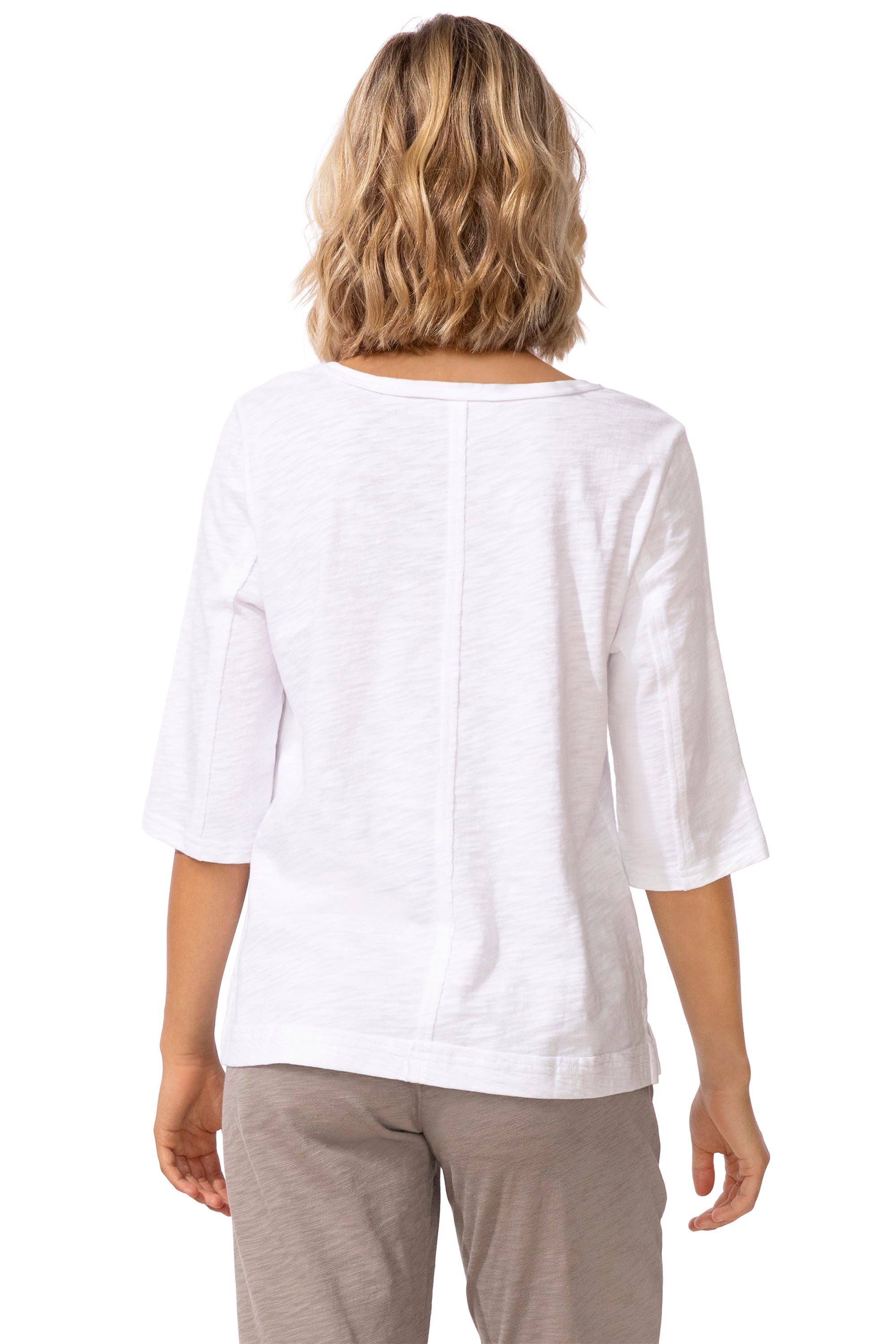 Crafted from Peruvian cotton jersey—renowned for its exceptional softness, durability, and strength—this tee features slub-textured yarns for a unique, nuanced finish and flattering elbow-length sleeves for easy coverage. Cover-stitched seams with raw-edge details, a softly feminine shape, and a subtle notched hem create elevated style with cool, comfortable wear.