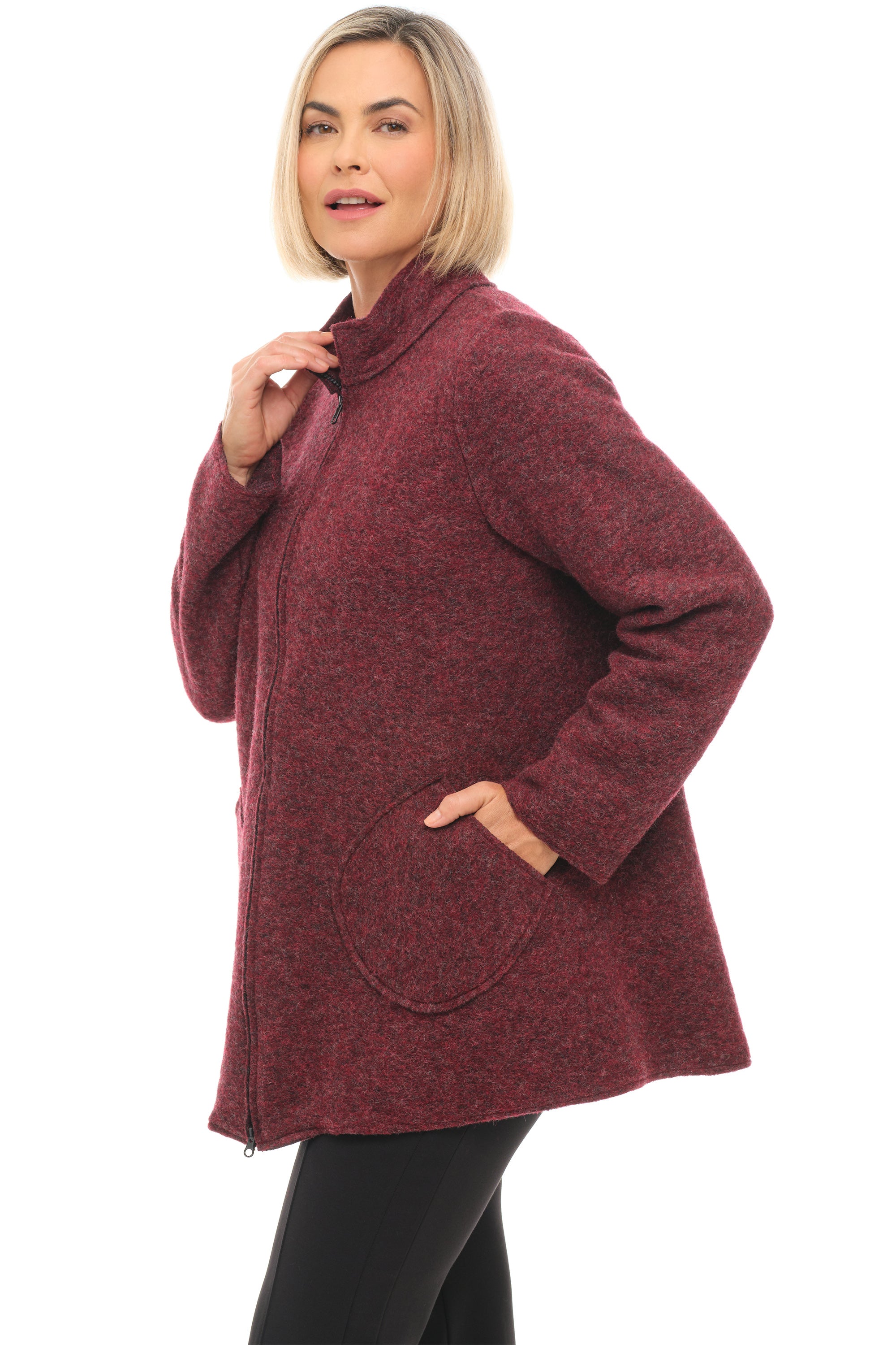 This boiled wool blend coat in a spicy mulled wine mélange brings classic tailoring a modern twist. Raw-edged seams and a two-way zip front add contemporary flair, while a stand collar and roomy patch pockets enhance functionality. The full-cut, swingy hem falls below the hip, offering a flattering, flowing silhouette that’s as comfortable as it is chic. A versatile statement piece, it exudes confidence and effortless style with every wear.