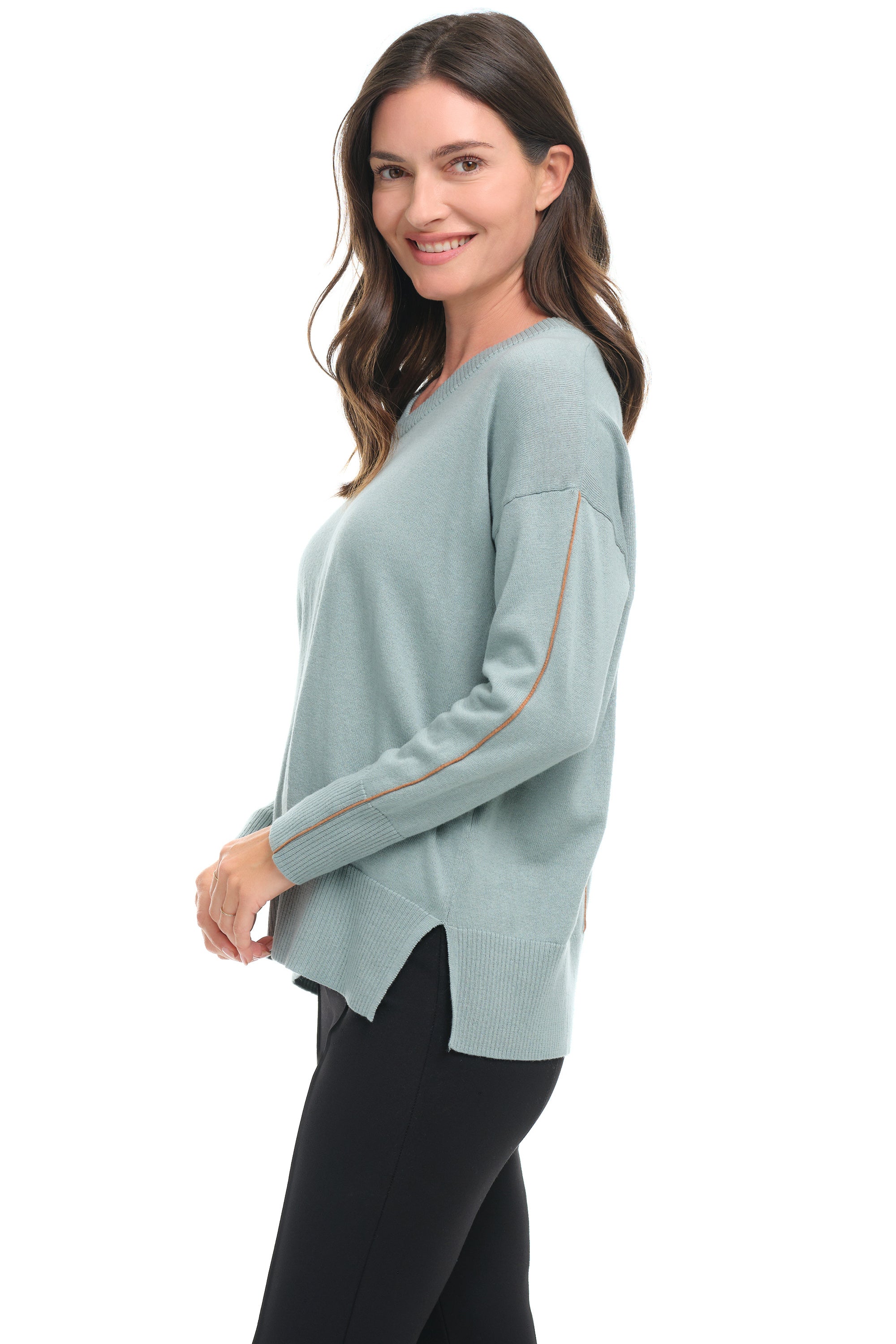 Lead with style in this ultra-soft cotton-cashmere pullover. In a serene duck-egg blue-green, it features a flattering V-neck, relaxed drop shoulders, and long sleeves accented with caramel stitching along the sleeves and back seam. The boxy, notched hem falls at the hip, while ribbed cuffs and hem keep it polished yet cozy. Effortlessly chic with a hint of playful charm, it’s a sweater that knows how to make an entrance.