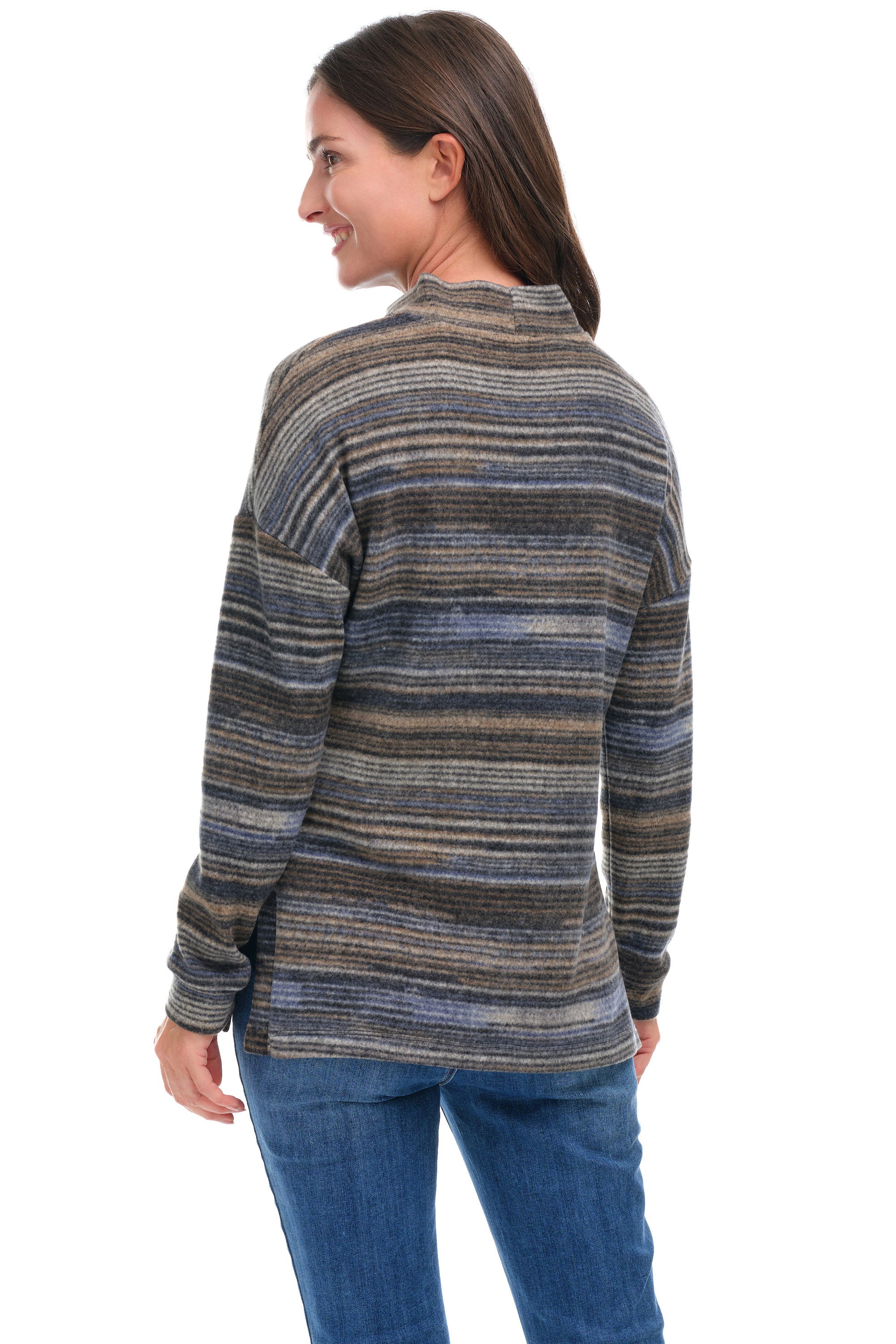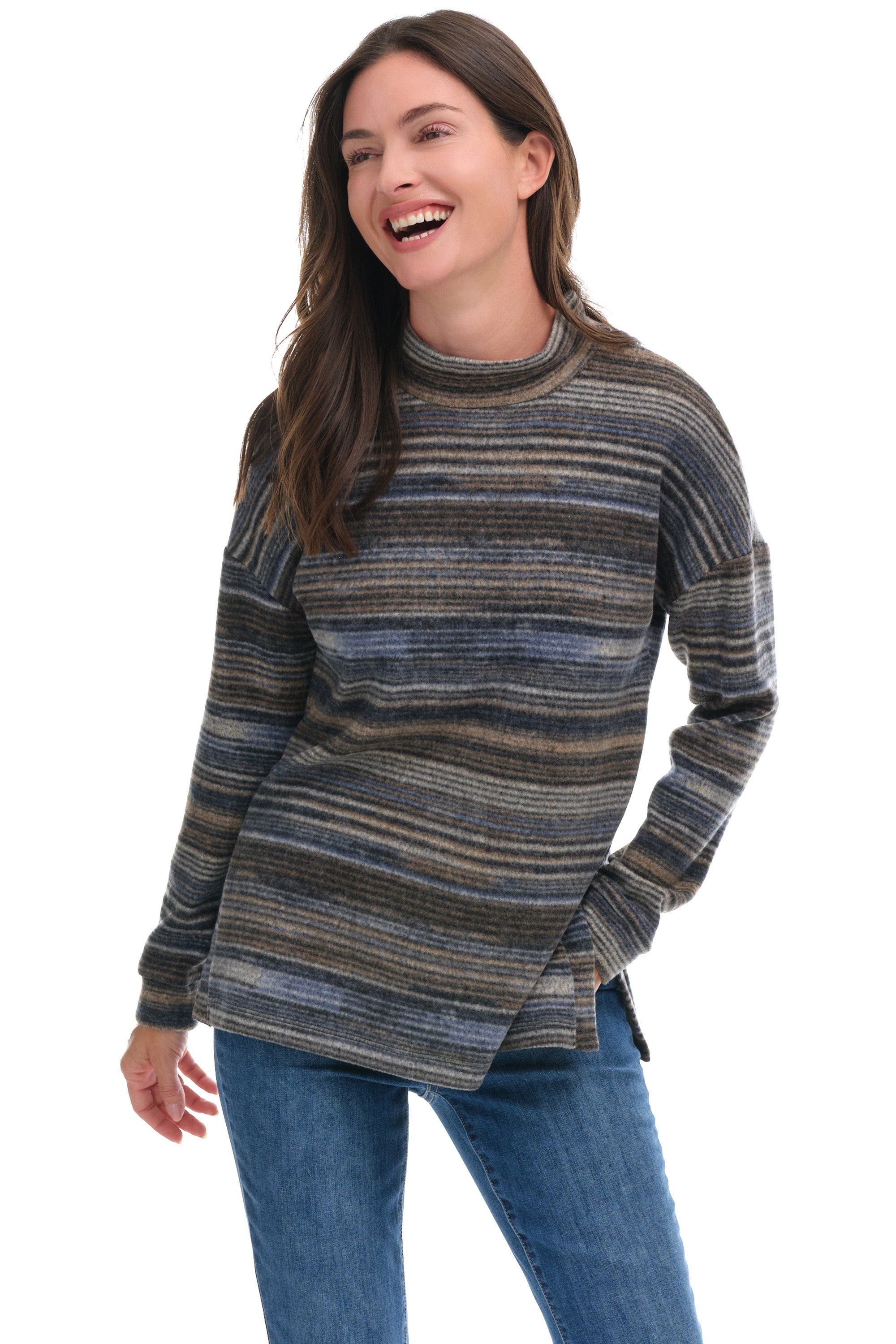 Wrap yourself in cozy comfort with this striped pullover mock neck, crafted in ultra-soft brushed jersey fleece. Bands of blue, taupe, and charcoal give it a modern, versatile look, while dropped shoulders and long sleeves with wide cuffs add relaxed ease. Finished with a deep split hem that falls below the hip, it’s the perfect layer for laid-back, chilly-day dressing.