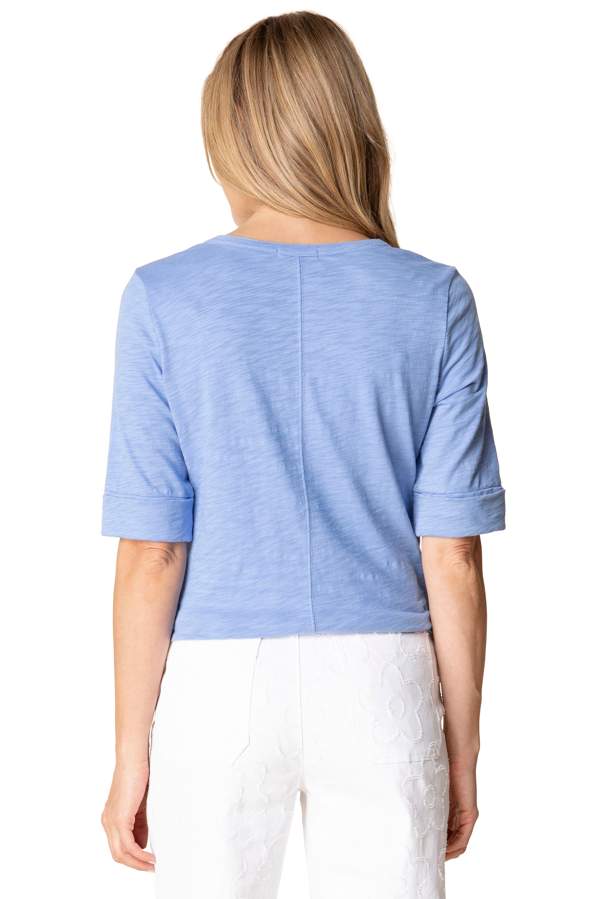 Crafted from pure cotton pebbled jersey, this pullover features a split-collar V-neck and flattering elbow-length sleeves with folded cuffs. Comfortable and versatile, it’s an easy choice for everyday wear.