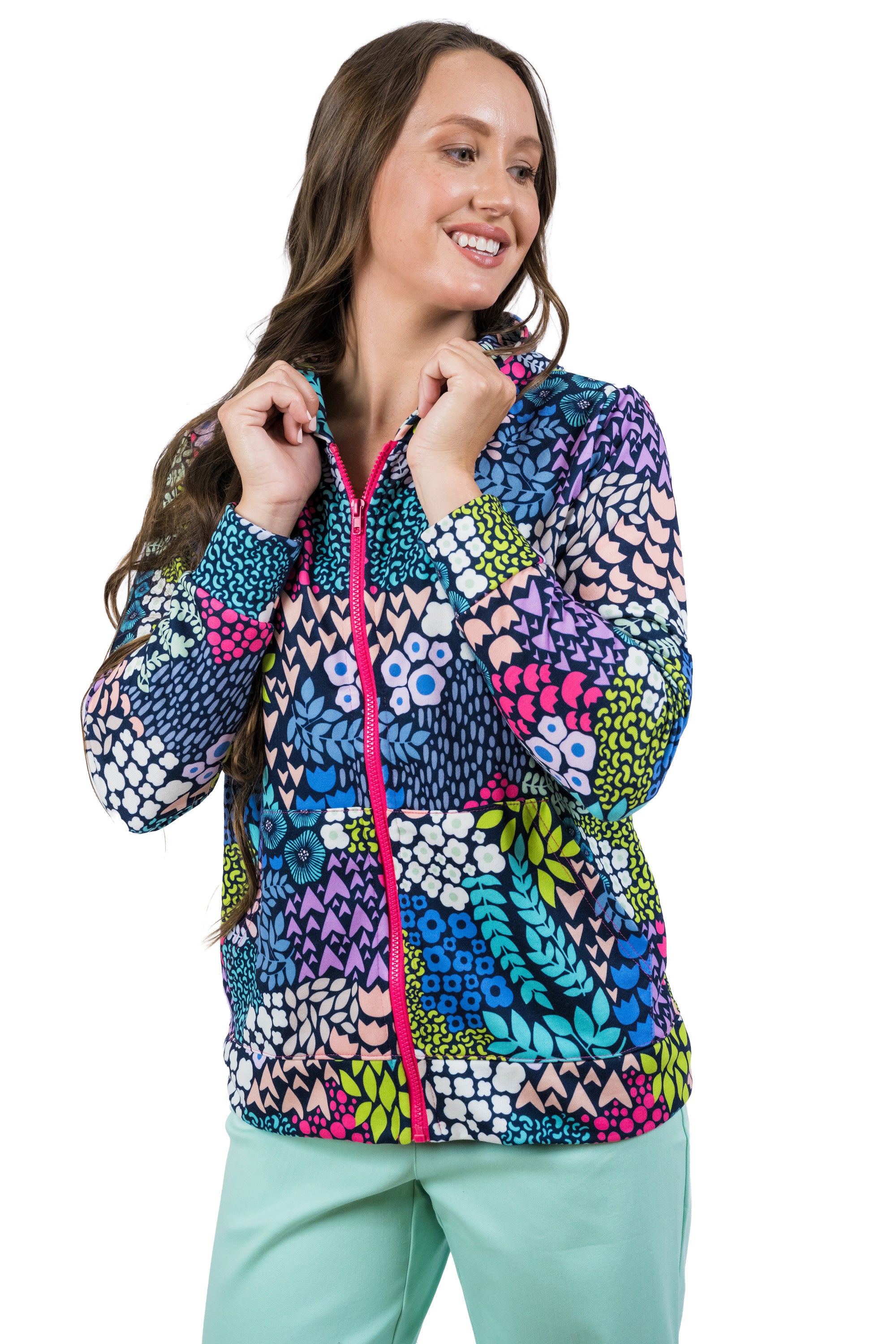 Add a playful pop of color to your wardrobe with this ditsy floral hoodie, featuring a fresh, vibrant print against a deep navy background. Crafted from luxuriously soft cotton-blend French terry jersey with a zip front and split kangaroo pockets, it’s equal parts cozy, bold, and a little bit luxe.