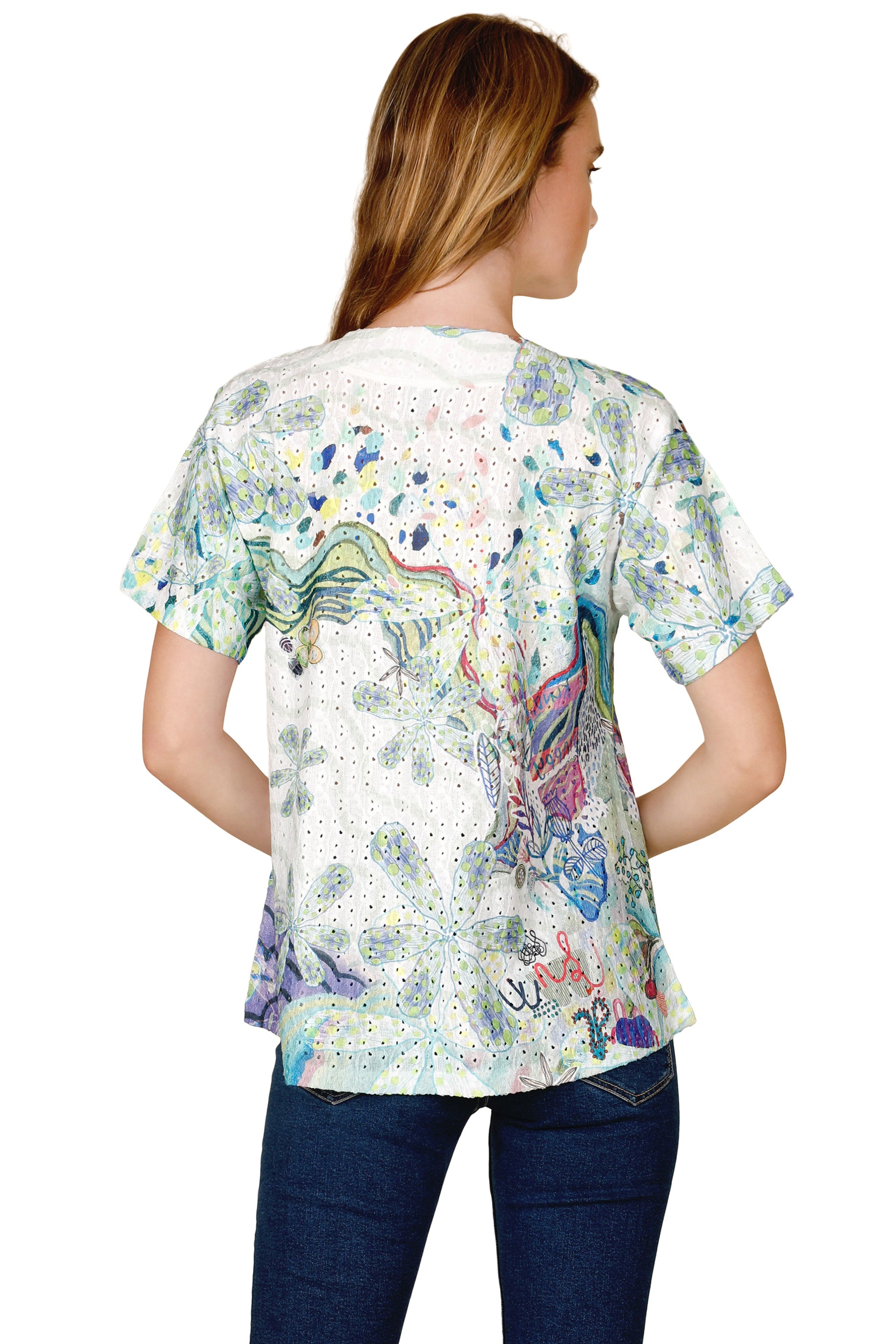 A joyful burst of color and nature comes to life in a bright floral design accented with whimsical graphics. Crafted from stretch jersey with feminine eyelet detailing, this pullover features a swingy A-line silhouette for light, breezy movement.