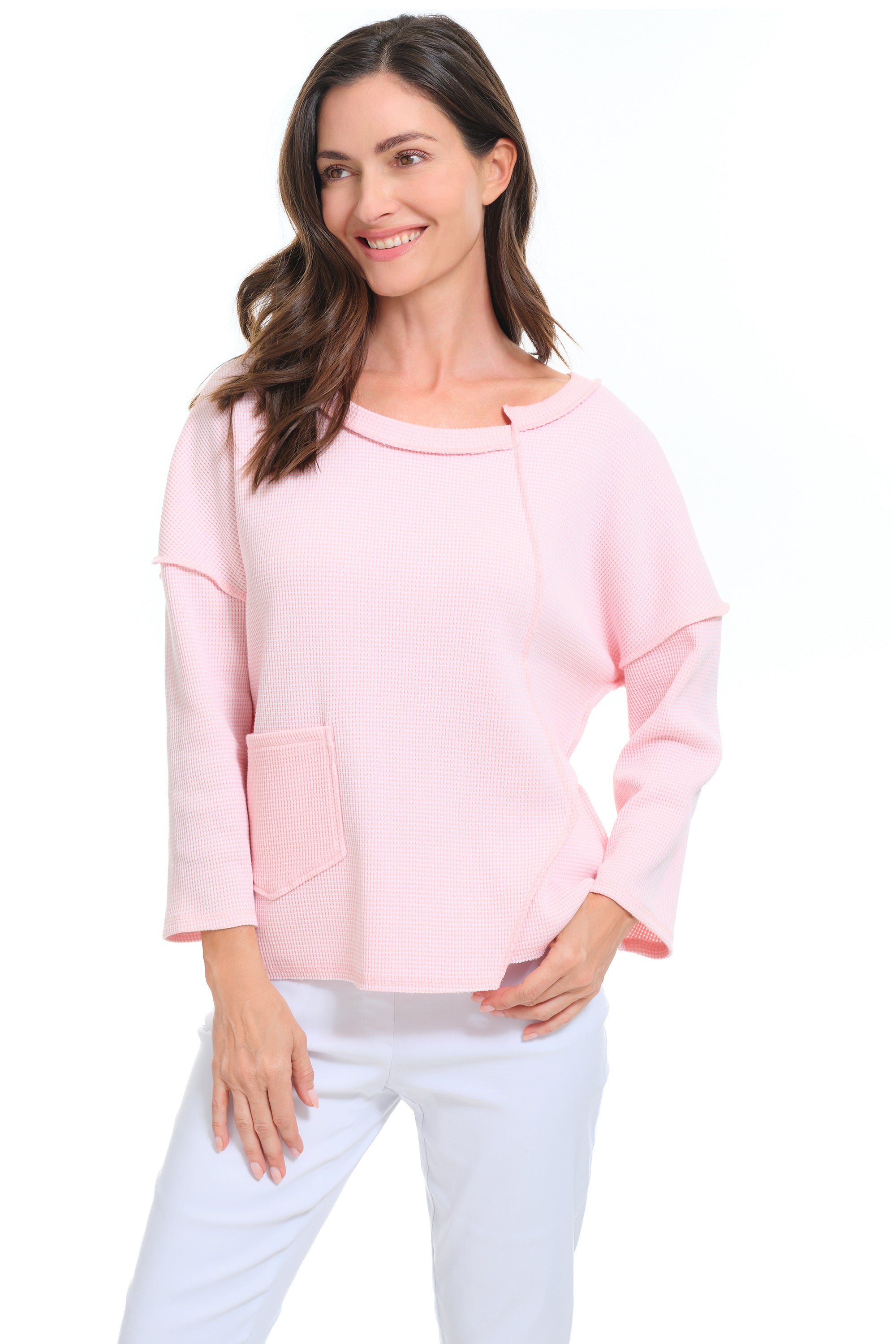 A little fun, a little funky—this dramatic pink-and-white pullover stands out in a lightly textured waffle-knit jersey. Reverse piecing, exposed stitching, a contrasting patch pocket, and an asymmetrical neckline with a raw-edged hem give it an artful, modern edge.