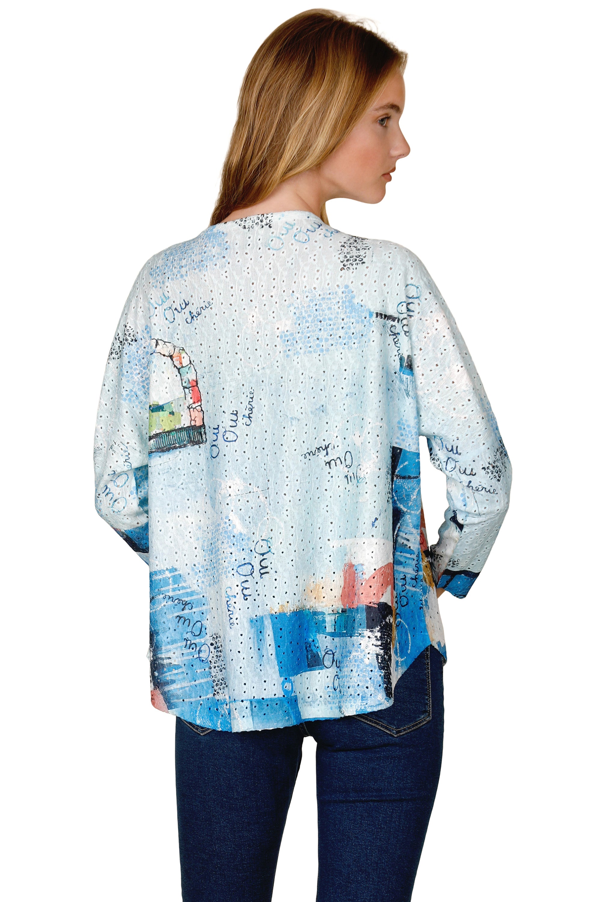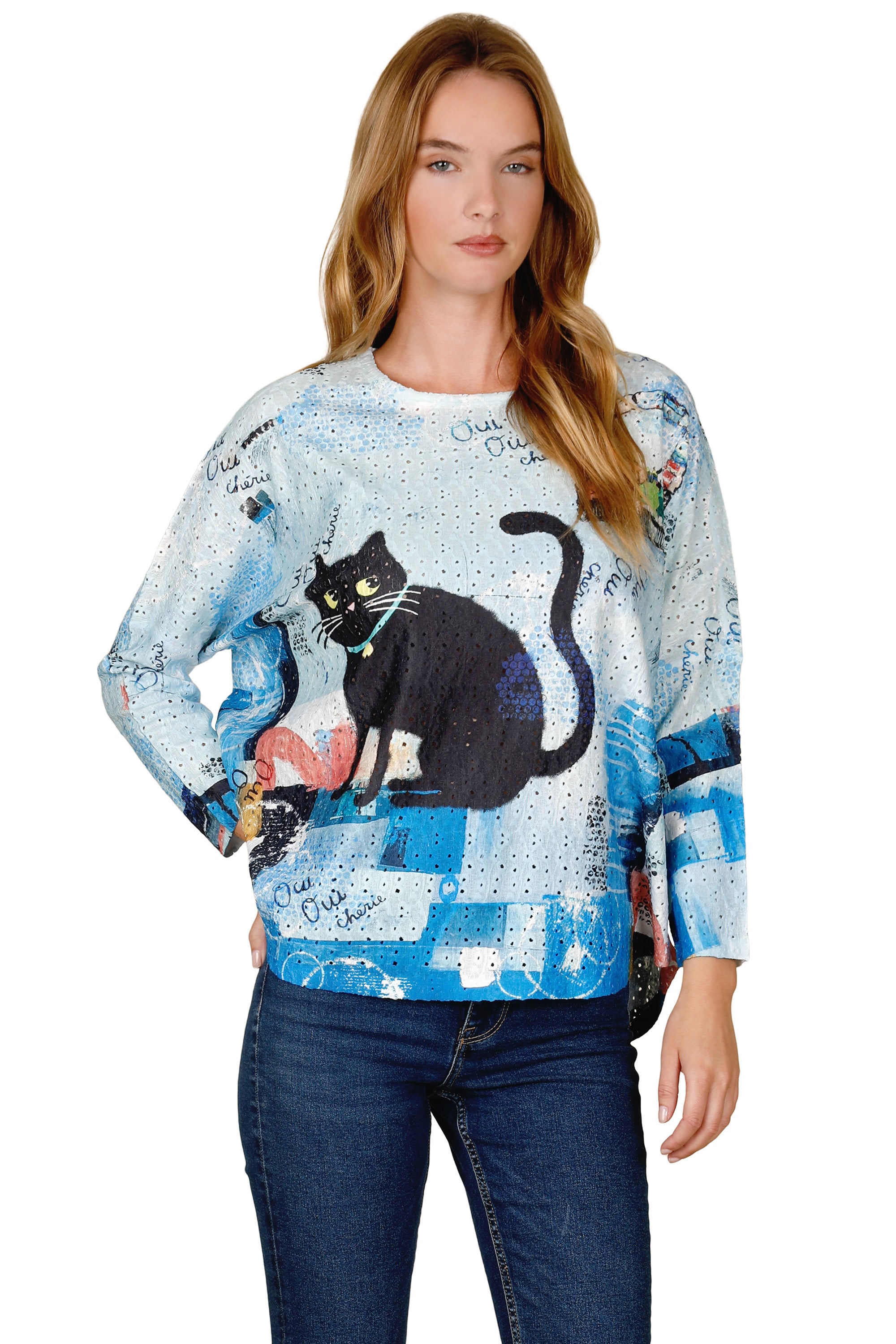 This charming top captures playful Parisian flair with a mischievous cat that demands attention. Crafted from stretch jersey with feminine eyelet detailing, it features exposed seams and a wide dolman fit for a relaxed, chic silhouette.