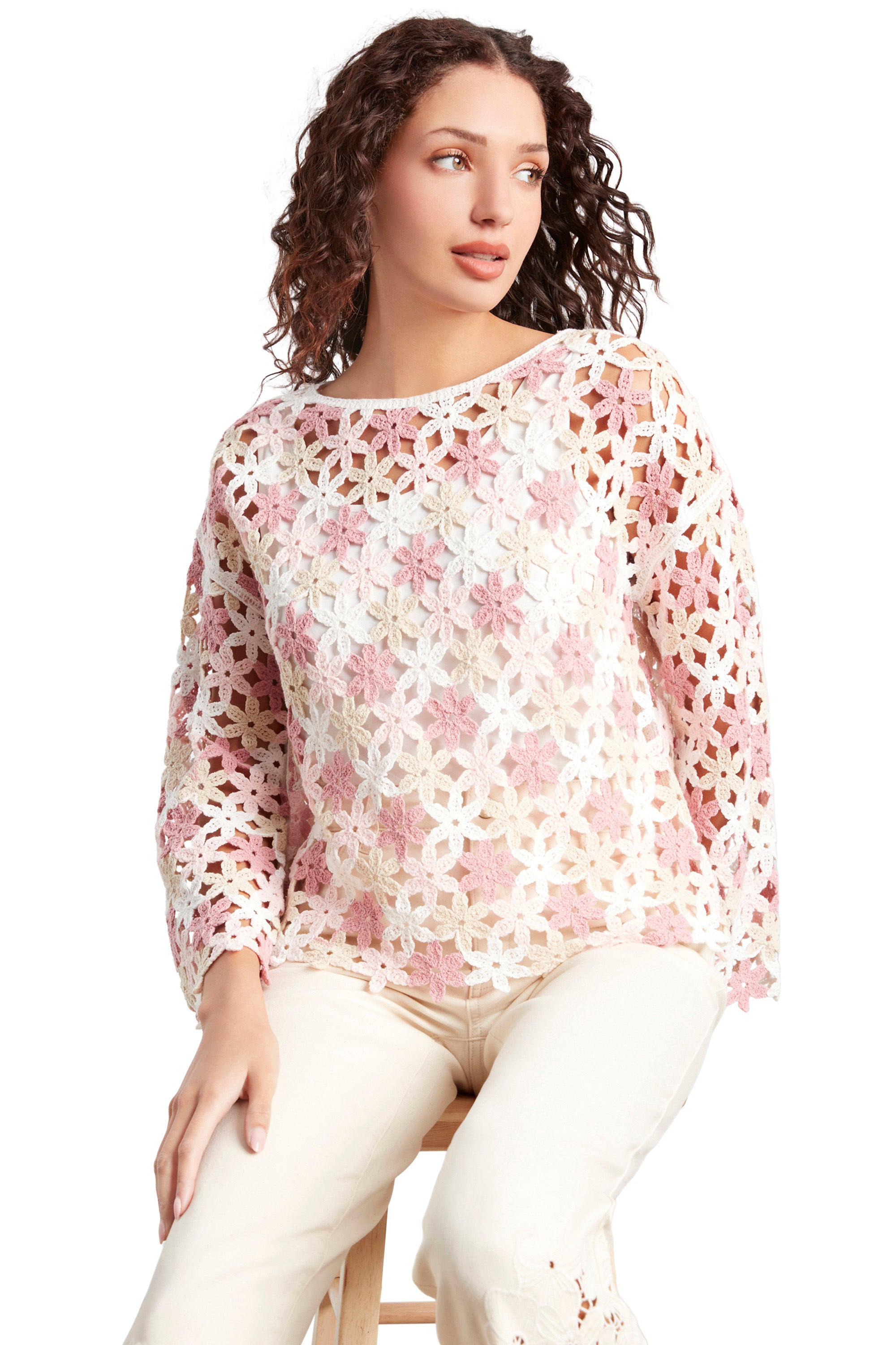 Pretty in pink, soft pastel florals lend a refined, feminine elegance to this cotton-rich, crocheted pullover. The openwork pattern reveals just a hint of skin, layering effortlessly over a tank or tee for sophisticated charm, perfect for special occasions or elevated everyday style.