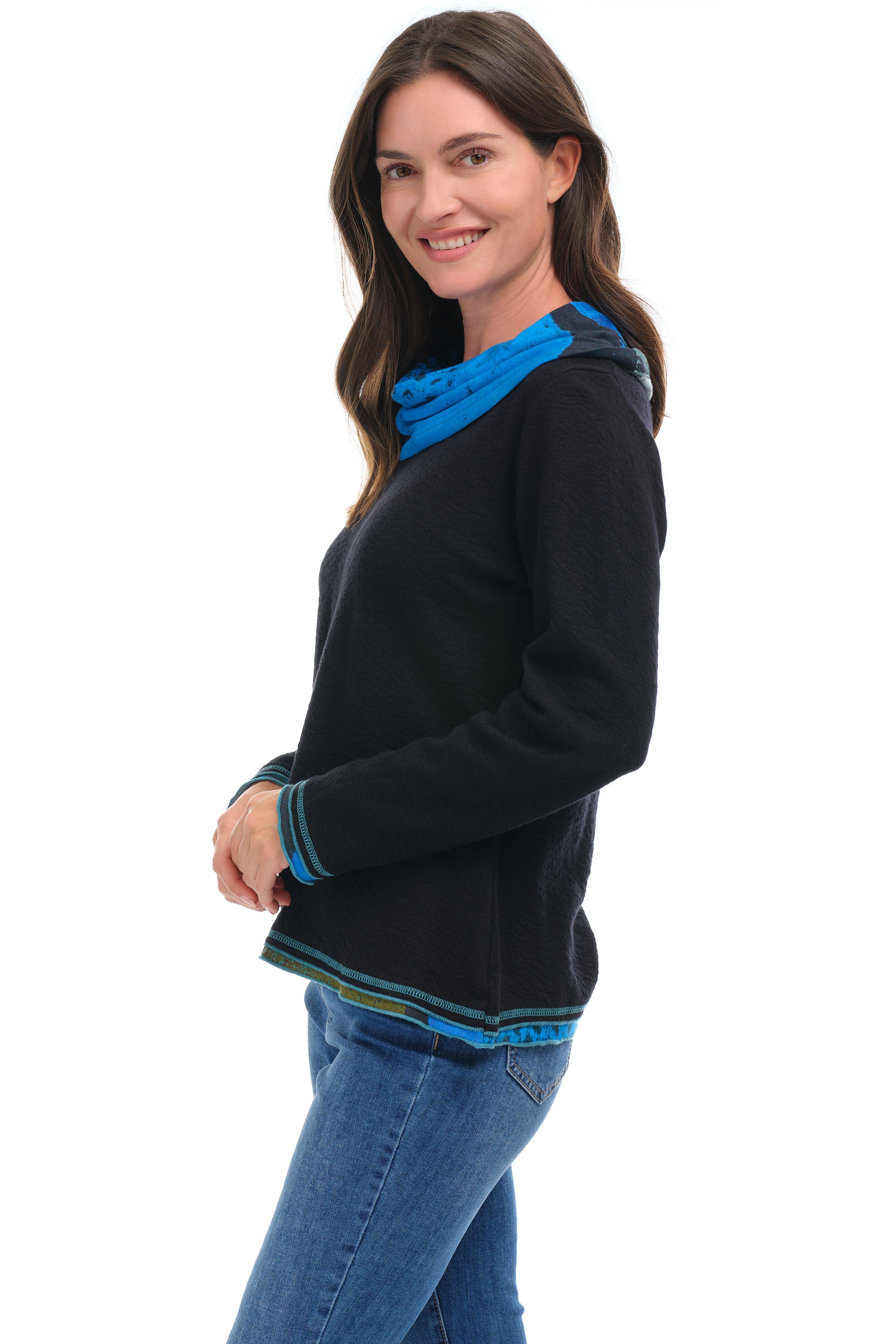 Cool blues and greens in an abstract washed print highlight the cowl, cuffs, and hem of this long-sleeve pullover. Crafted from soft, stretchy cotton-blend textured jersey, it offers cozy comfort with a stylish edge. The layered cuffs are echoed in the A-line layered hem that falls at the hip, while subtle exposed stitching adds a modern, slightly edgy touch.