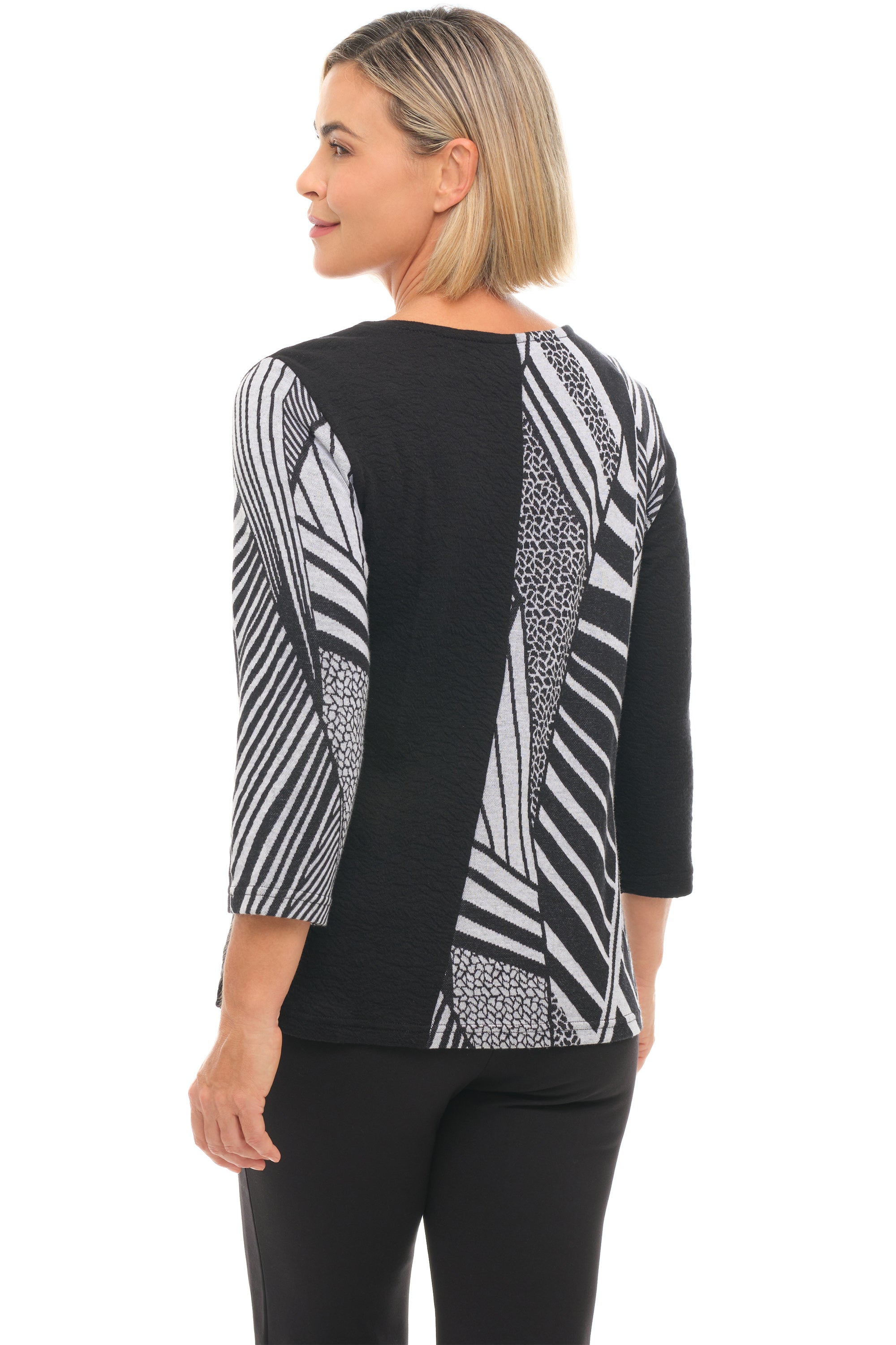 Striking in black and white, this soft and stretchy cotton-blend jersey top pairs an abstract print with solid contrast. The wrap-inspired pullover design features an off-center seam accented by a single decorative button. A V-neckline and ¾ sleeves create a flattering look, while the gently rounded split-front hem falls at the hip. Versatile and easy to dress up, it adds modern detail to any wardrobe.