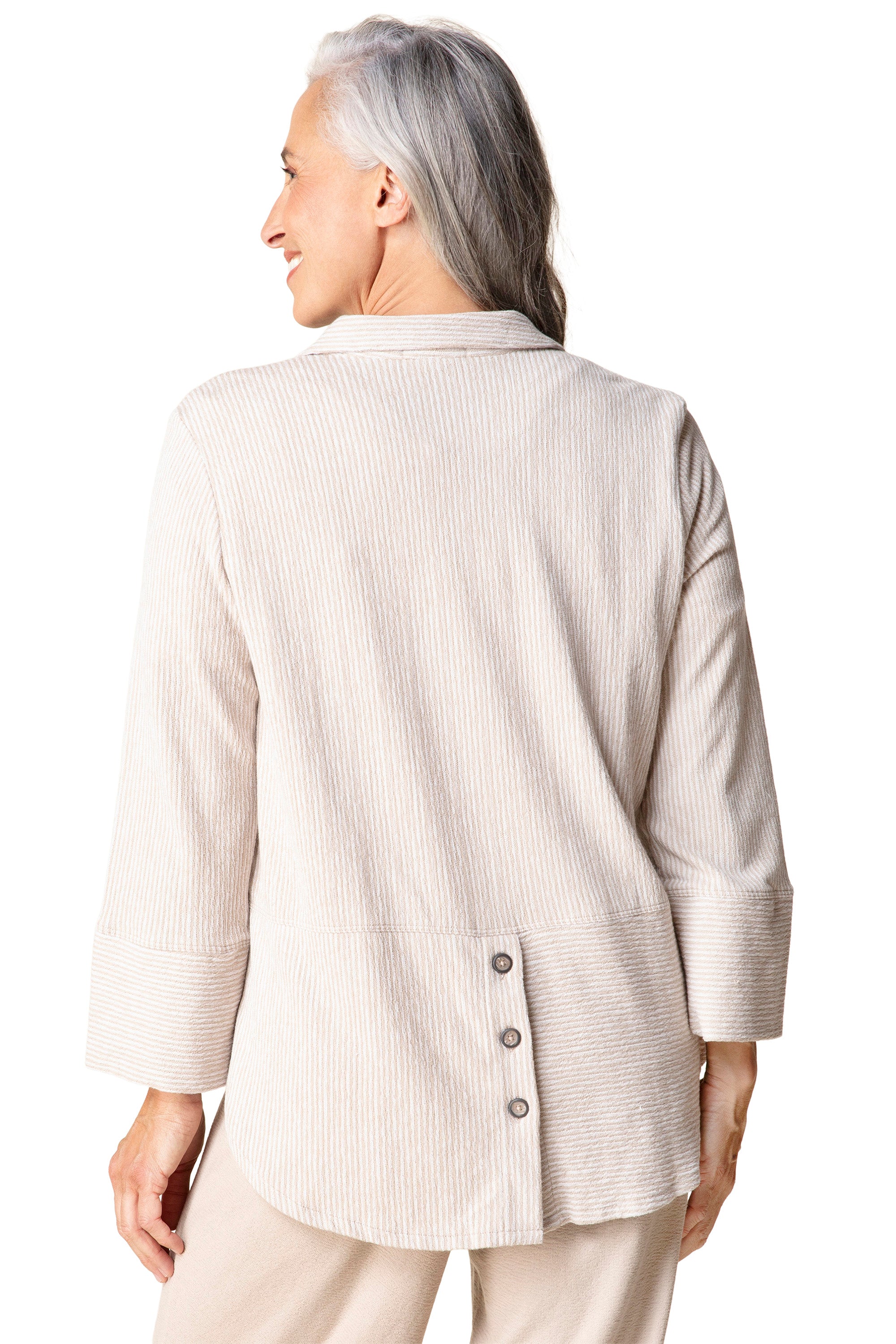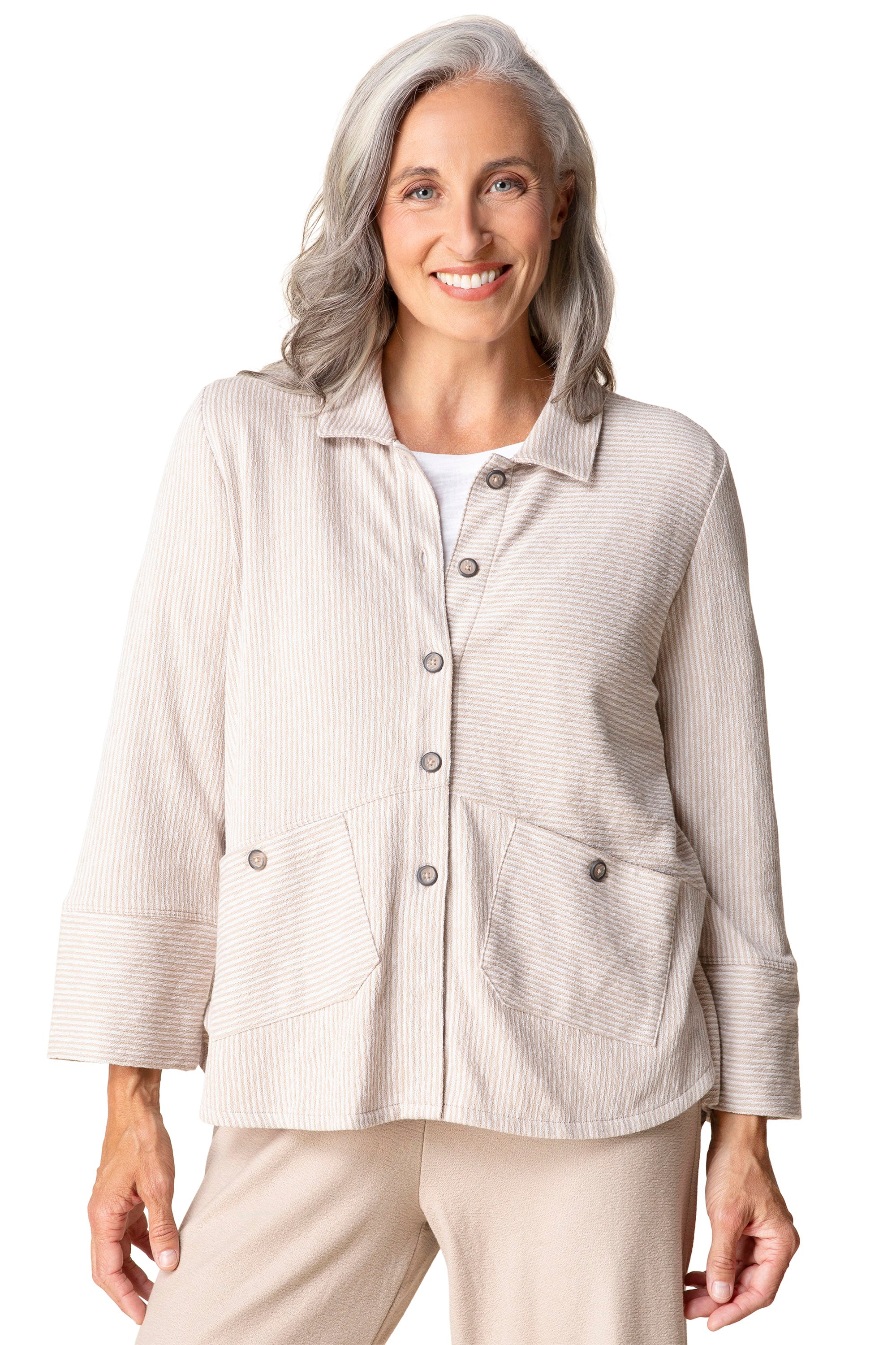 Crafted from nubby knit pure cotton jersey, this button-down blouse pairs earthy taupe and white stripes with mixed-direction striping for subtle dimension. Diagonal patch pockets with button accents and a rounded hi-lo hem complete the easy, casual look, and it can also be worn as a light jacket.