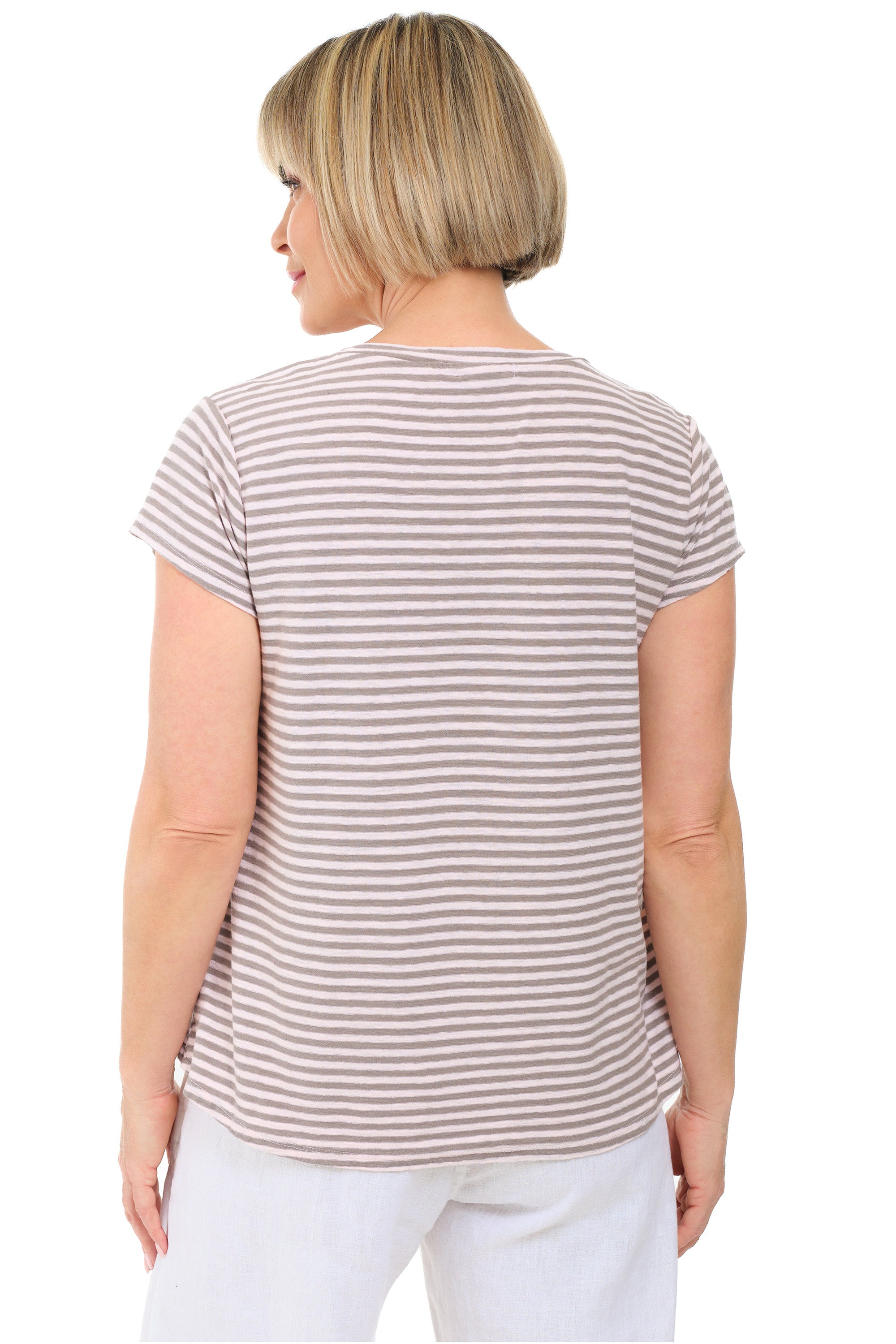 This easy-care tee is crafted from a soft linen–cotton blend jersey with classic stripes that never go out of style. Designed with a flattering V-neck pullover and a subtle hi-lo hem, it’s an everyday essential with timeless appeal.