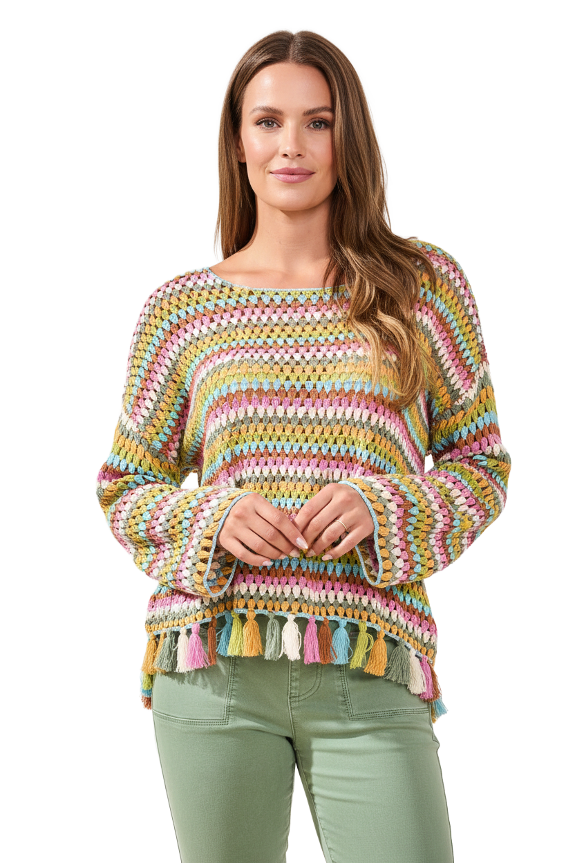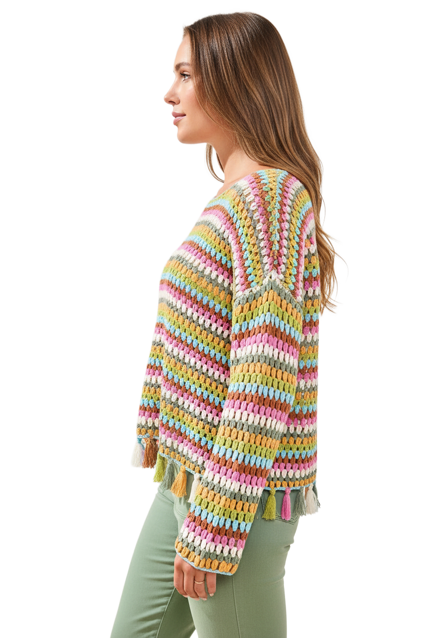 Be sunshine-ready in a retro crocheted pullover in pure cotton, finished with fun tassels and breezy long bell sleeves. Easygoing and playful, it brings a relaxed, laid-back vibe to beach days, boardwalk strolls, and everywhere in between.