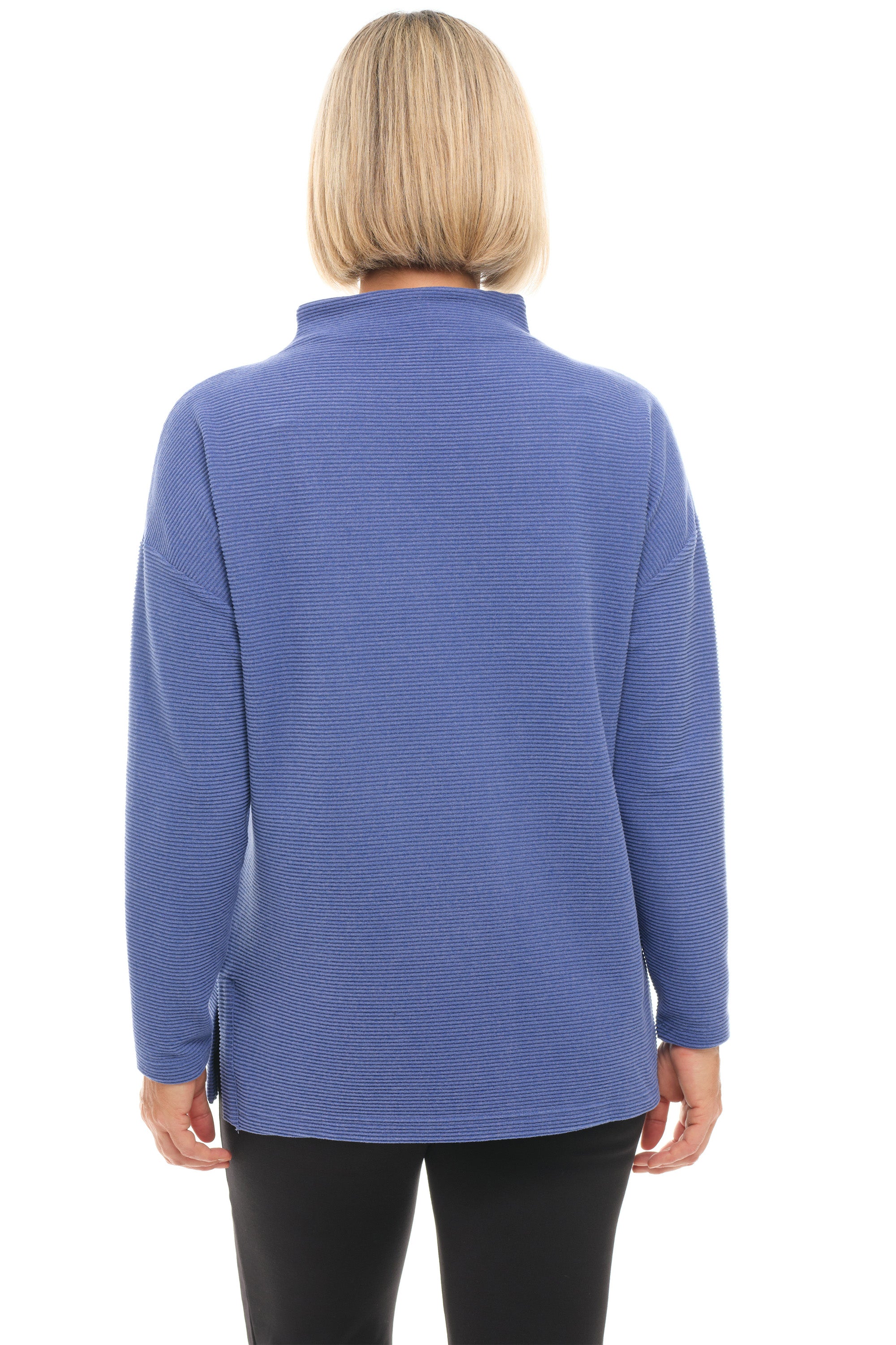 Wrap yourself in cozy sophistication with this funnel neck pullover, crafted from a lightly textured, horizontal ribbed brushed knit. Its soft, dreamy blue-violet hue brings a touch of elegance to everyday wear. Designed with dropped shoulders and long sleeves for a relaxed fit, it features a straight hem with side slits that falls just below the hip—perfect for layering or wearing on its own. A chic balance of comfort and style, it’s destined to be a go-to favorite.