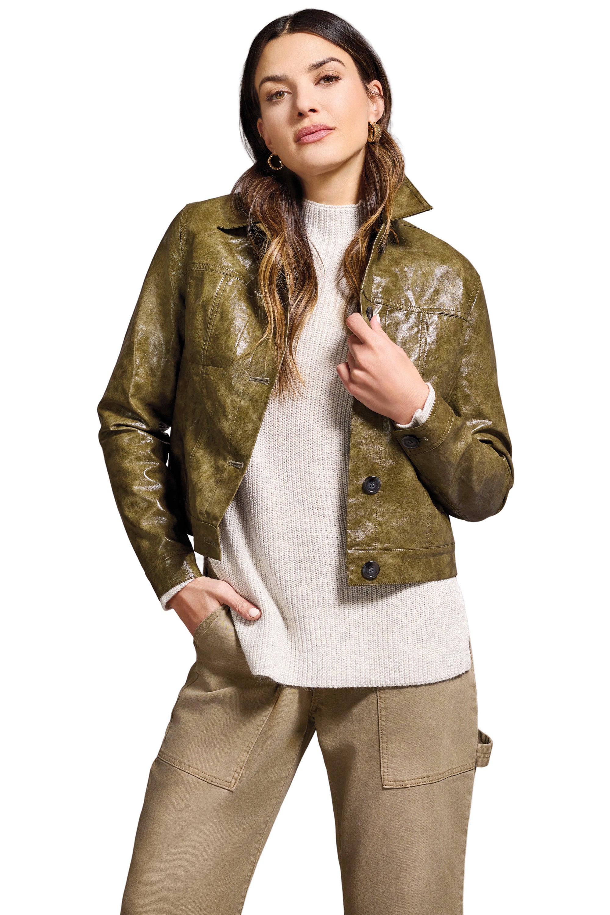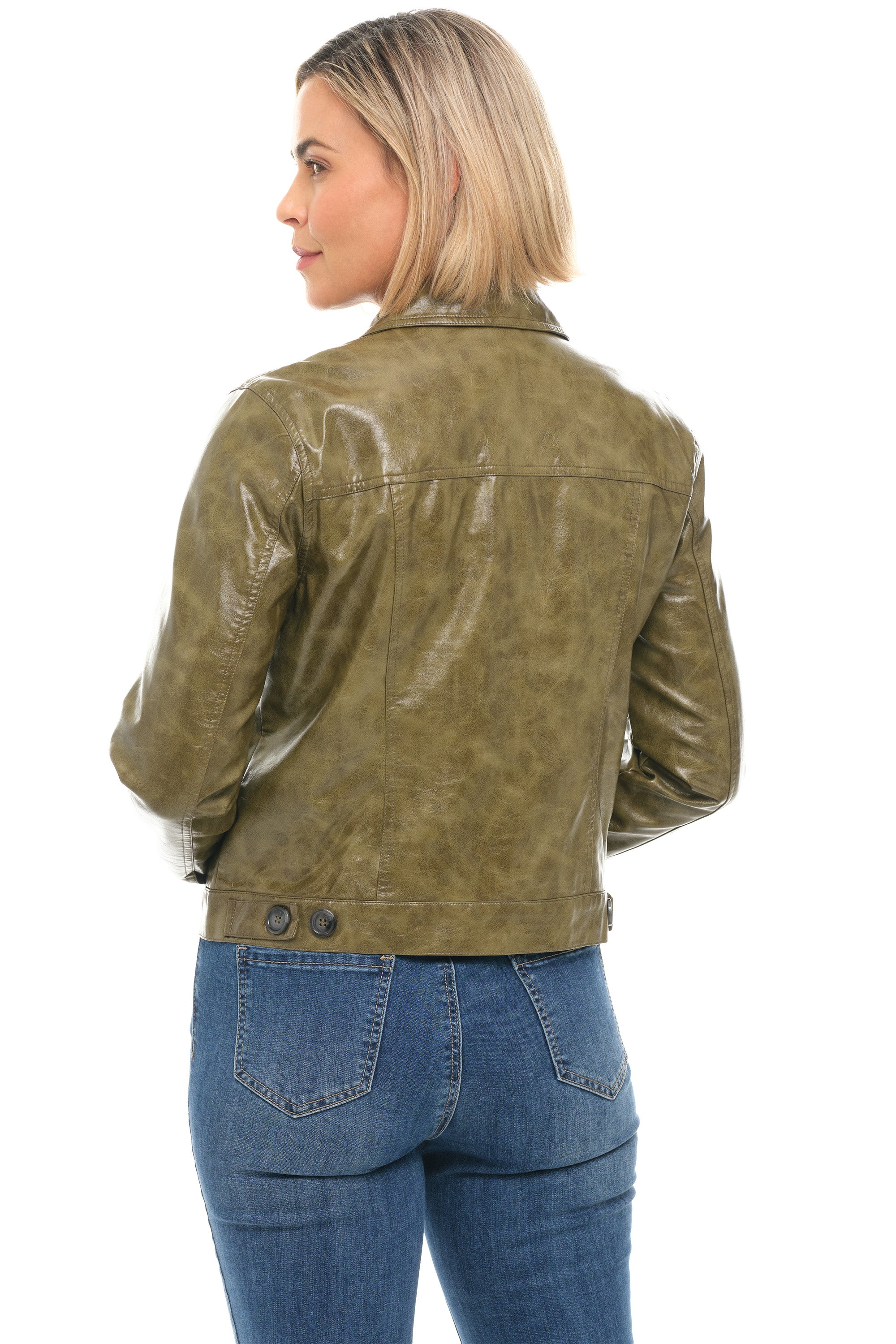 The iconic bomber reimagined with bold sophistication. Cut in sleek faux leather in a striking leafy green, this jacket delivers a commanding urban edge. A wide collar and button-front closure frame the look, while dual chest pockets and welted slash pockets balance function with sharp detail. Long sleeves with buttoned cuffs and an adjustable waist create a structured silhouette that sits perfectly at the hip. A statement piece with undeniable attitude.