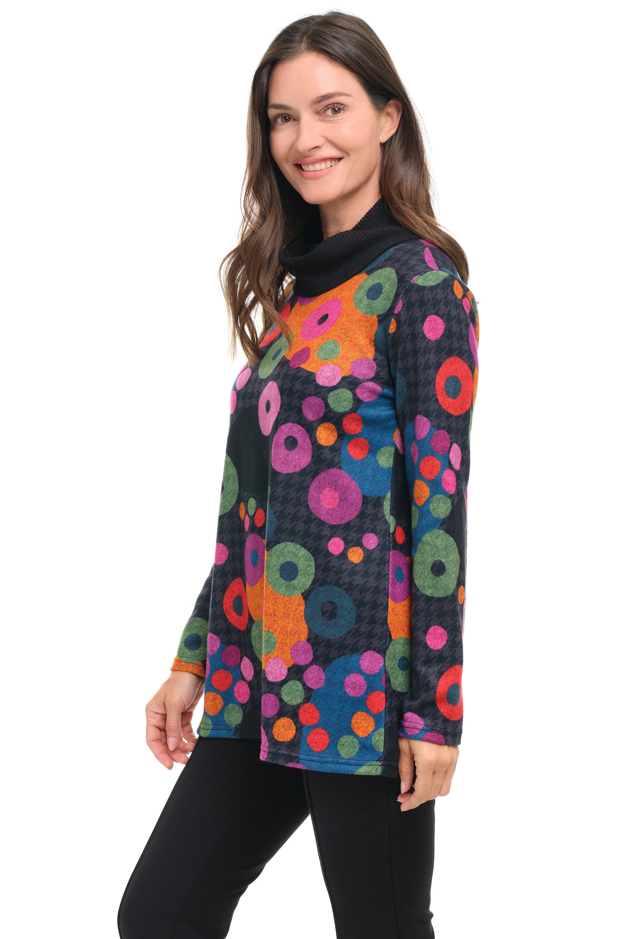 Bring the party with you in this bright and playful brushed sweater knit pullover. A cascade of multicolored dots pops against heathered black, striking the perfect balance of whimsy and bold graphic edge. Finished with a solid black ribbed cowl neck, long sleeves, and an easy A-line hem that falls below the hip, it’s a statement sweater that’s equal parts cozy, colorful, and fun.